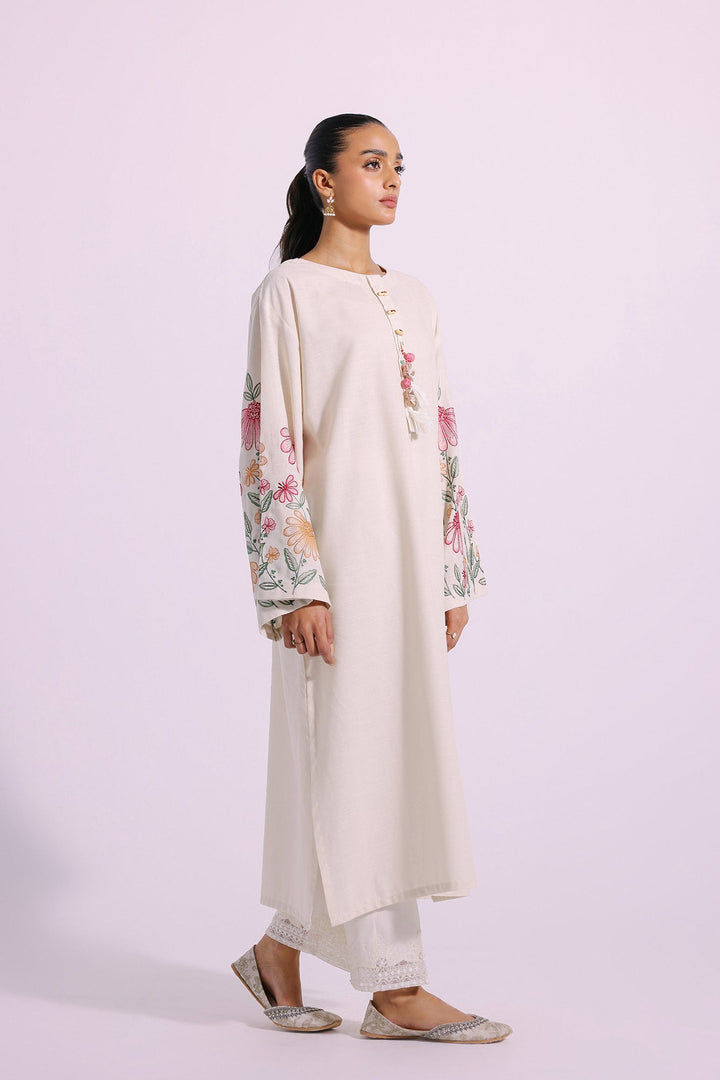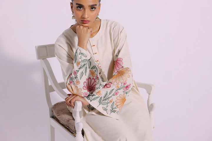 The gorgeous outfit is a graceful and elegant piece that gives a classy look. The vanilla ice shirt is crafted in a contemporary silhouette and is enhanced with beautiful floral embroidery on sleeves in vibrant hues. Enhanced with trendy beads and add ons at front adds a celestial, sophisticated look to the shirt.