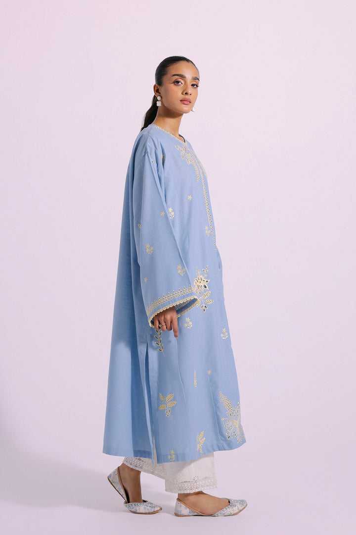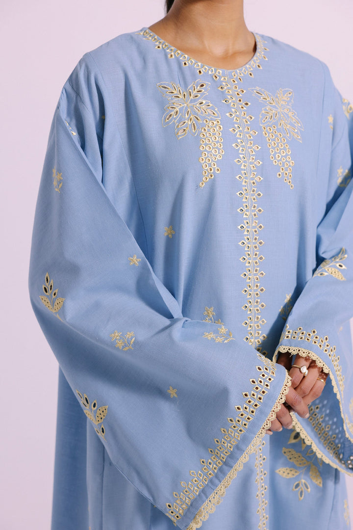 This mesmerizing outfit is an elegant and chic shirt made of subtle baby blue fabric and featuring captivating intricate floral embroidery with schiffli designs in contrasted ivory white shade. Crafted in a classy A-line silhouette, this elegant shirt is a perfect option to look graceful this season.