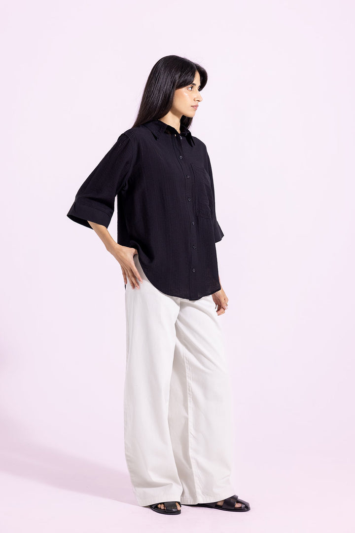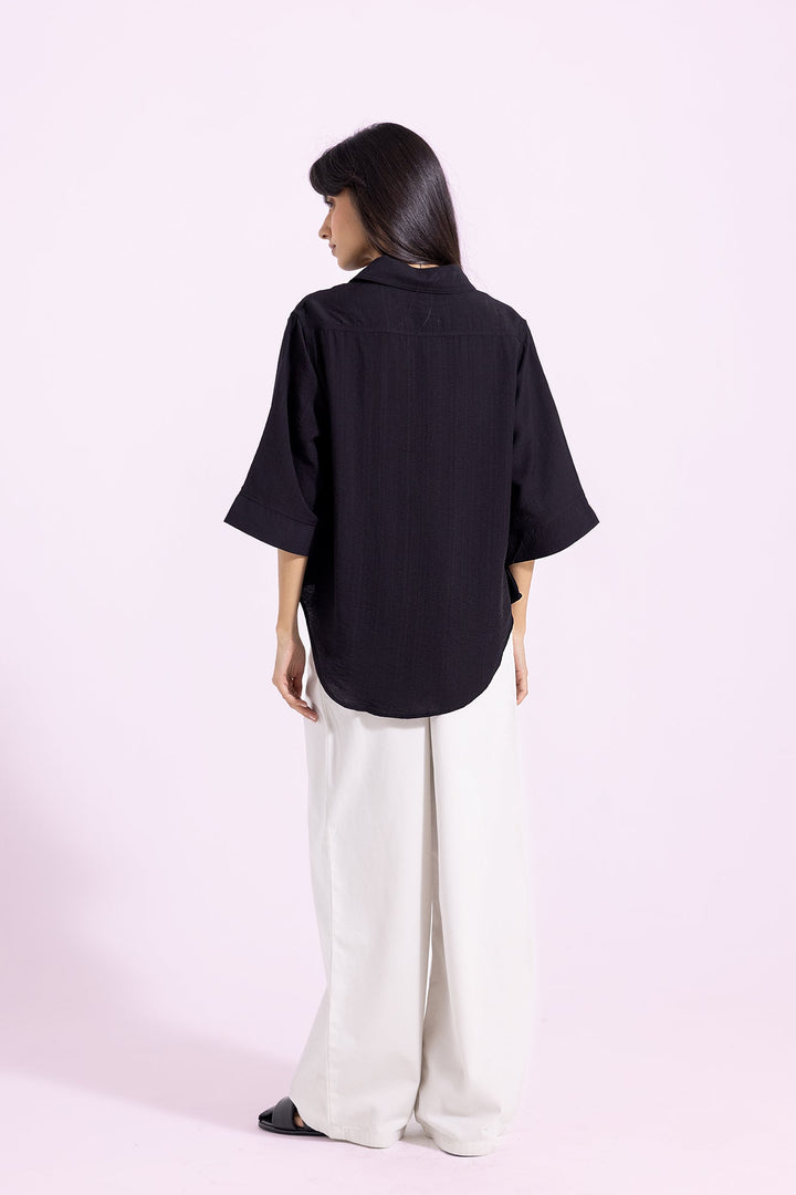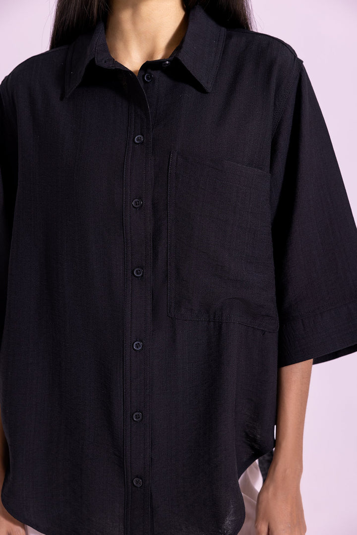 A classy yet elegant design is portrayed on this contemporary button down shirt rendered in a charming deep black shade. Crafted in an resplendent silhouette with collar neck, this trendy shirt is a great option for casual gatherings.
