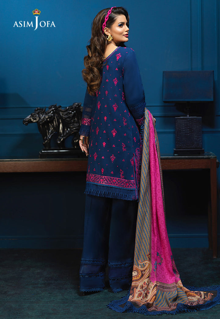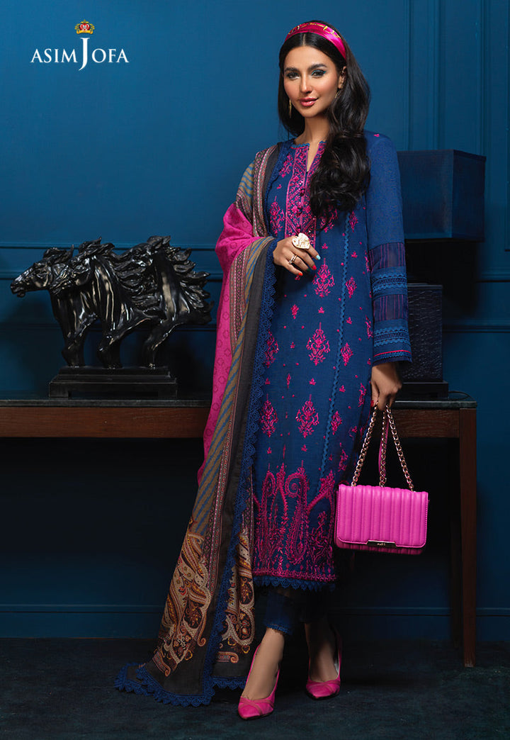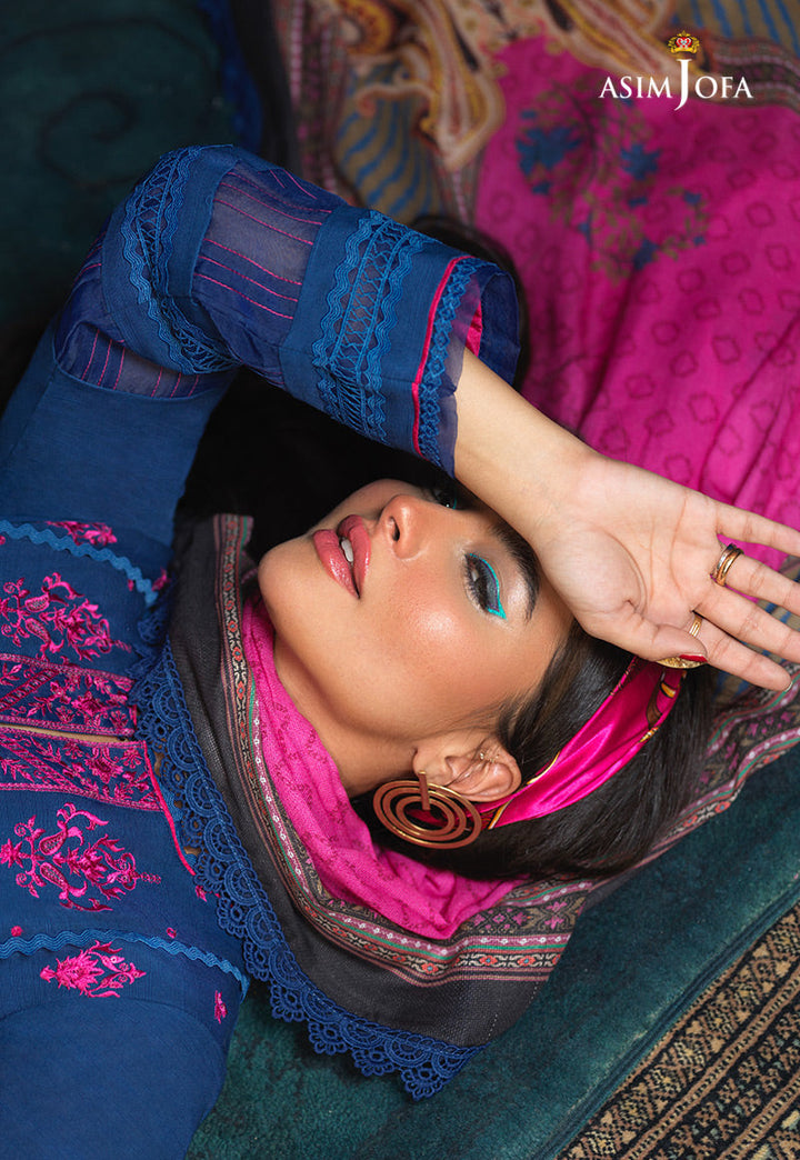 Warm up to the winters donning this cobalt blue number sprawled on slub khaddar worked in fuchsia thread with transparent sequins. It comes with a boldly printed cotton square dupatta and dyed pants.