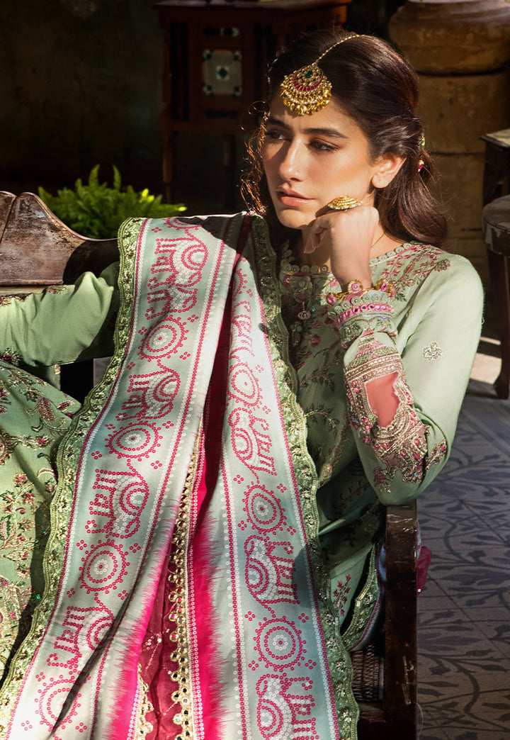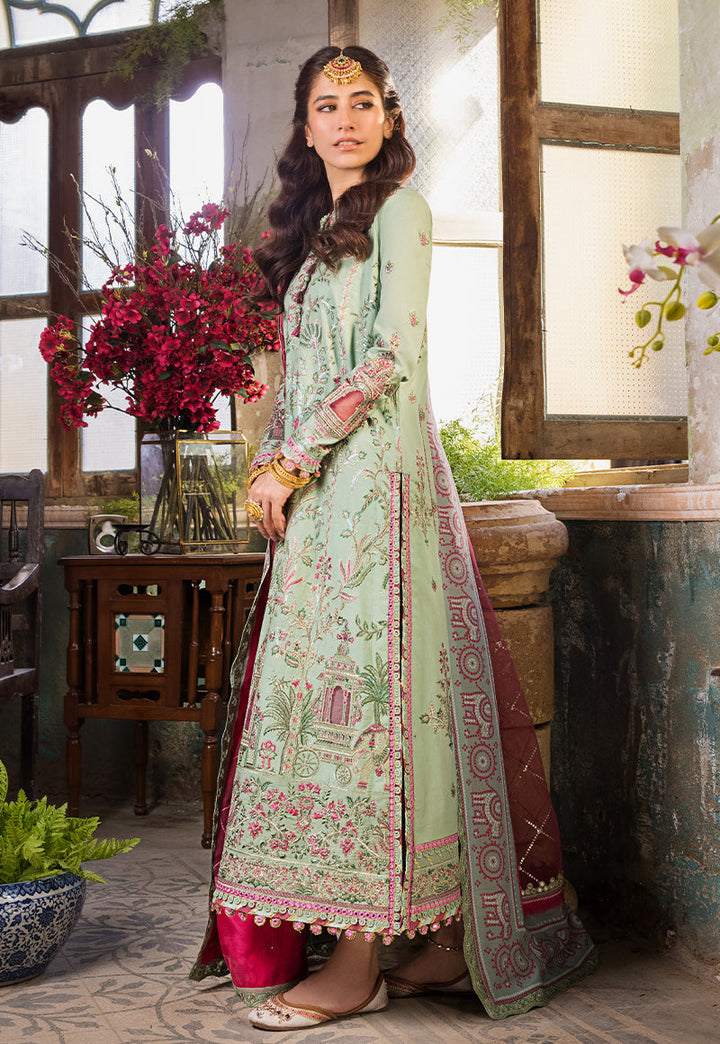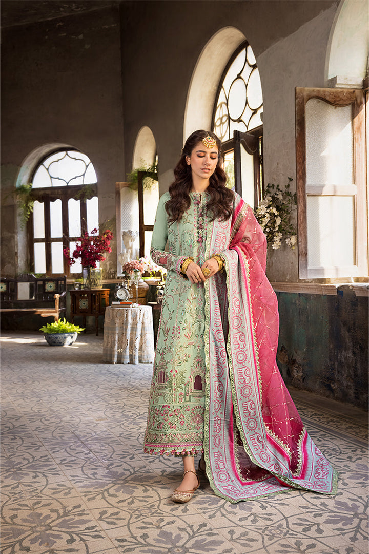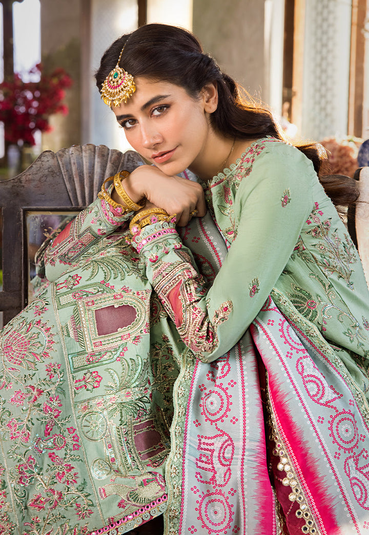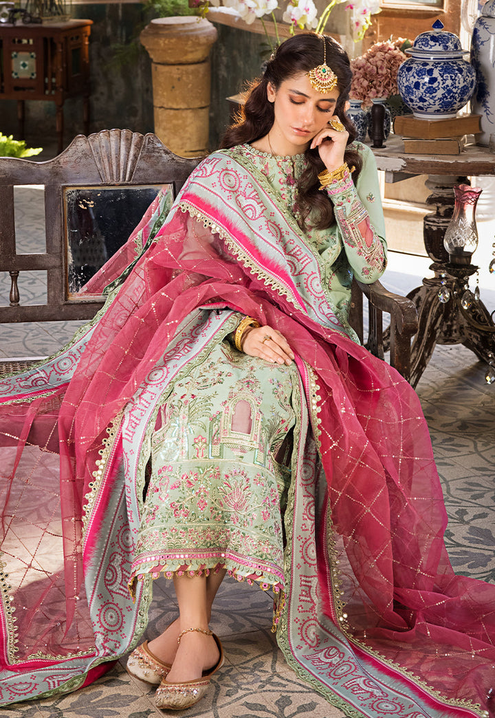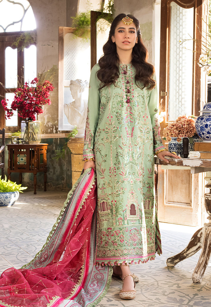 Syra is like breath of fresh air dressed in this soothing palette. Heavily embroidered shirt designed on the ideology of old Mughal imagery comes with applique inserts giving it a relief kind feel with embroidery being embossed & organza inserts used to bring focus on jharokas & carriages made beautifully with threadwork & light rose gold zari with expansive use of multi tinted spangles. It comes with a beautifully embroidered salmon pink organza dupatta bordered with bandhni printed border making it a unique design to add to your summer wardrobe. It comes with dyed pants.