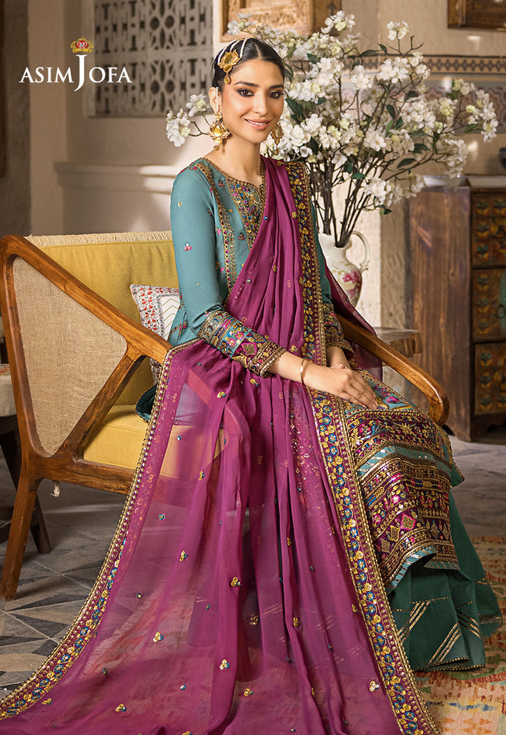 A beautifully composed design on a dull ocean green lawn is brightened by articulate use of threads in the shades of dull pinks & purple used with antique gold zari & sequins fashioned in a center & side panel style with wide embroidered borders on plum colored silk. Vibrant violet colored embroidered chiffon dupatta adds an apt contrast in this stellar ensemble.