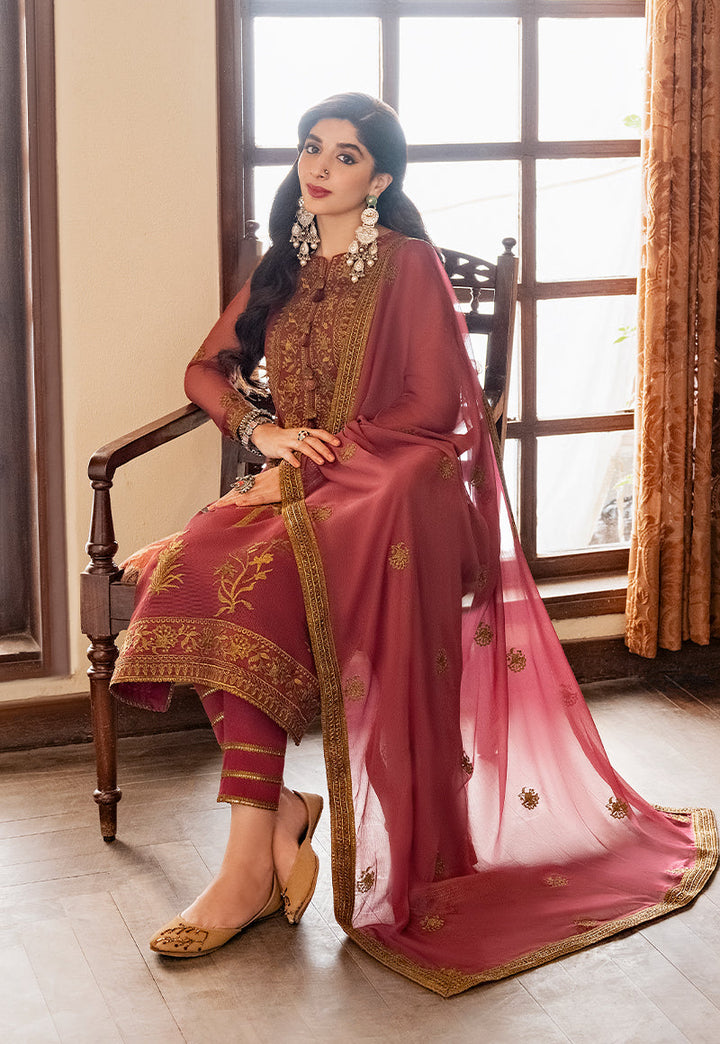 A different shade of muted mahogany comes alive with antique gold embroidery fashioned into bold statement motifs shirt sprawled all over the shirt topped by a heavy neckline & borders giving it a distinct feel. Embroidered chiffon dupatta & dyed trouser further accentuates this elegant design.