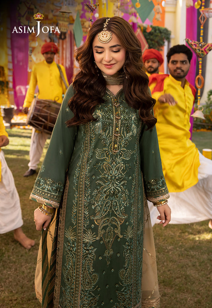 Enter an Enchanted Basil Garden of Love with this mesmerizing ensemble from the "Gur Naal Ishq Mitha" collection. Asim Jofa's creation under the enchanting spell of Basant Festival is a celebration of love in hues of basil green. The contemporary and paisley motifs adorned with threadwork and light gold sequins create an elegant tapestry. The contrast of beige color in the embroidery and borders of the shirt and dupatta is a chapter in the book of love—a journey into the heart of romance where every stitch is a metaphorical note in the symphony of emotions.