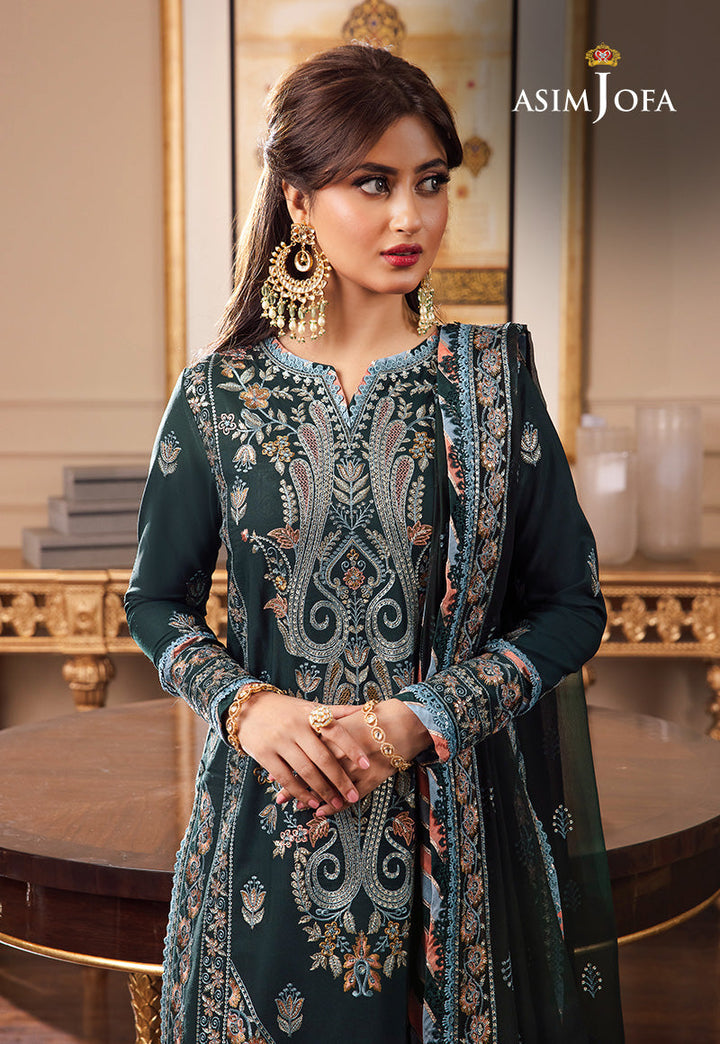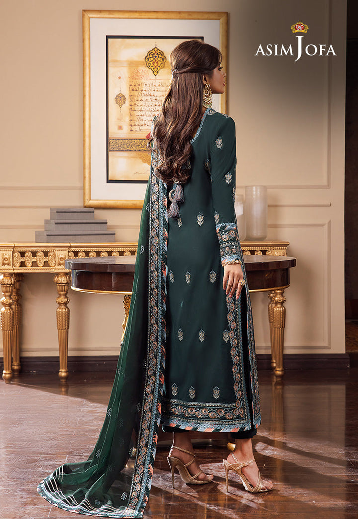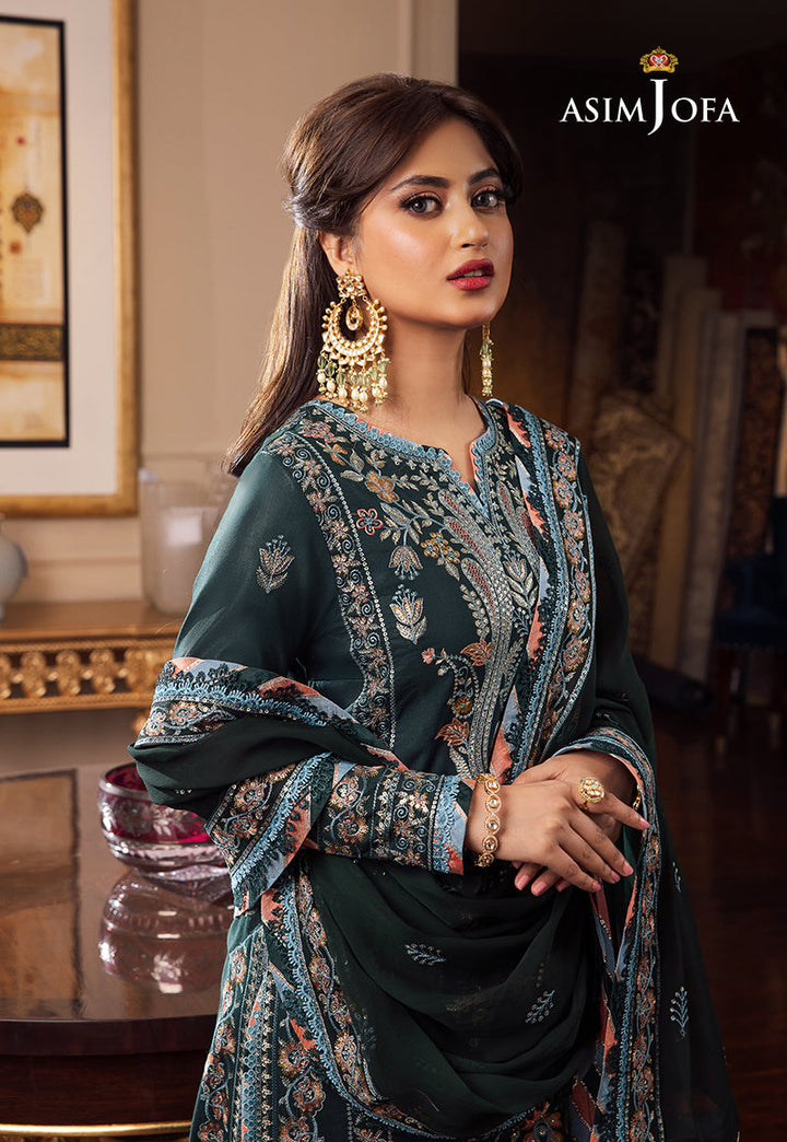 A fusion of traditional and contemporary fashion, here comes this sophisticated dark green number. This embroidered outfit is an enchanting piece from the “Rang-E-Noor” collection. Embellished with threadwork in muted tea pink, light blue, and shimmering zariwork, it glistens with silver sequins, creating an ethereal aesthetic.
