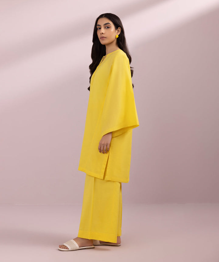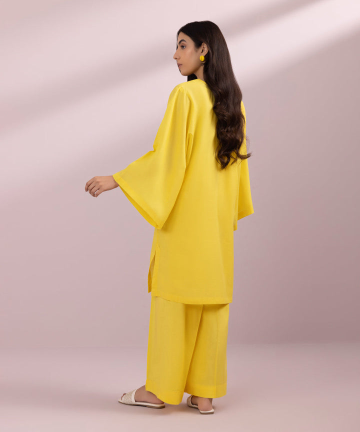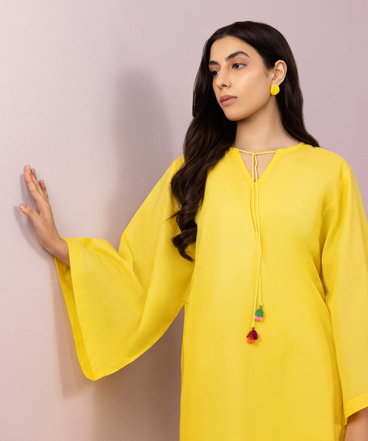 Turn heads in our bright yellow boxy silhouette featuring intricate detailing.