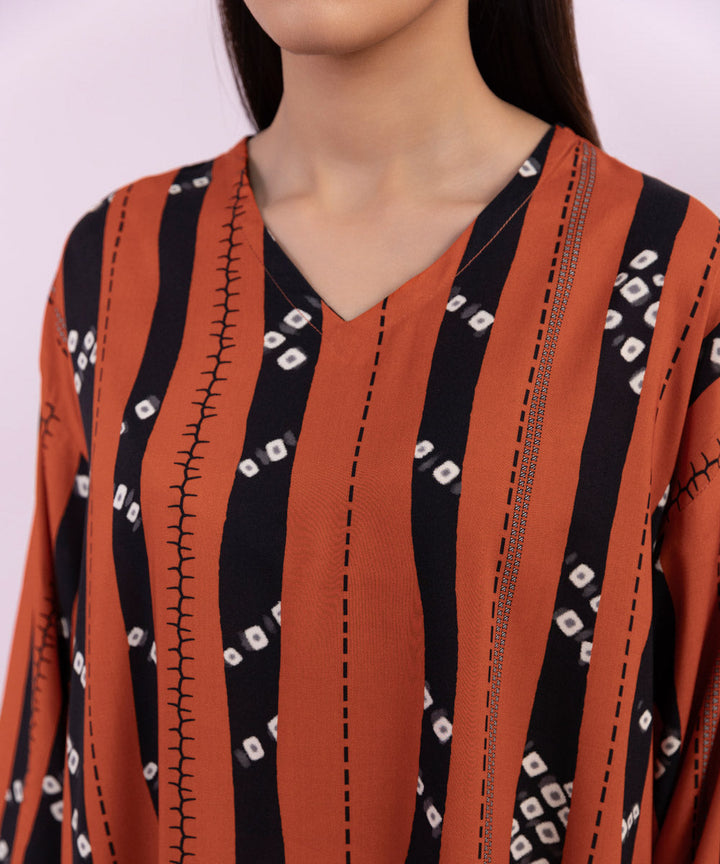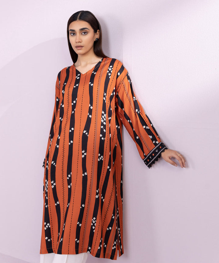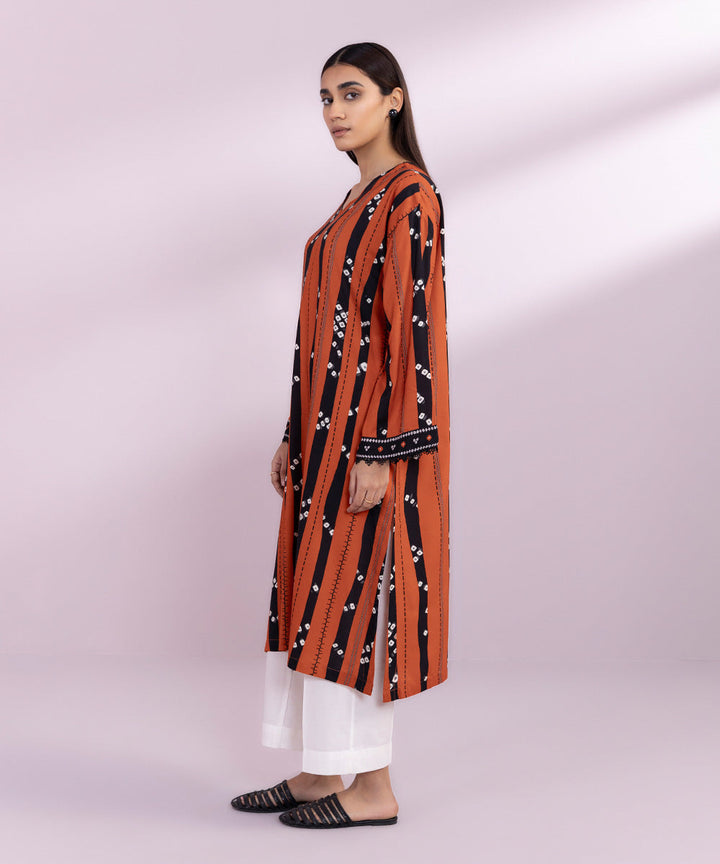 Make a statement with our printed, long Arabic lawn shirt featuring a V-neck.