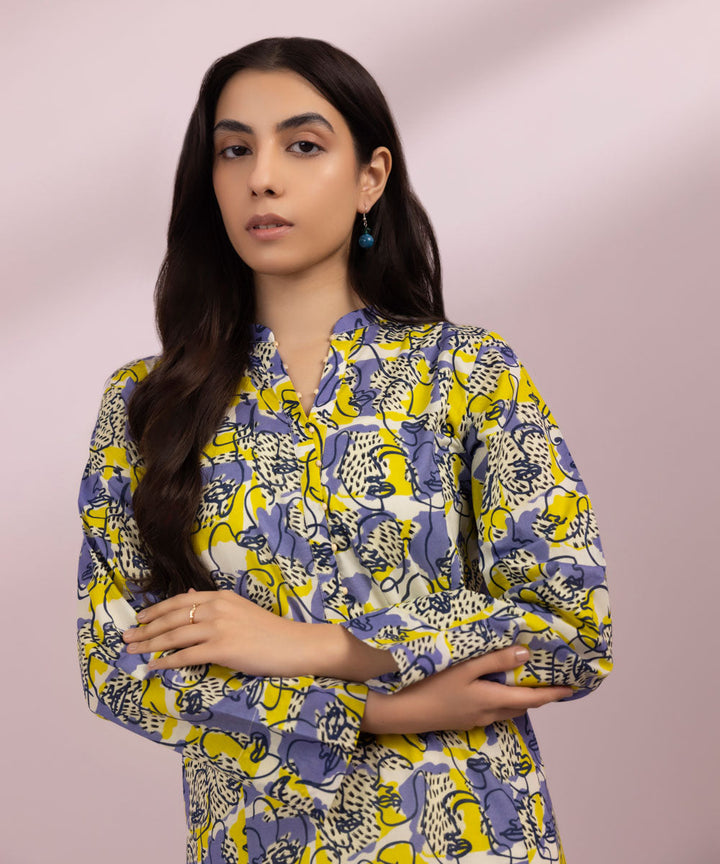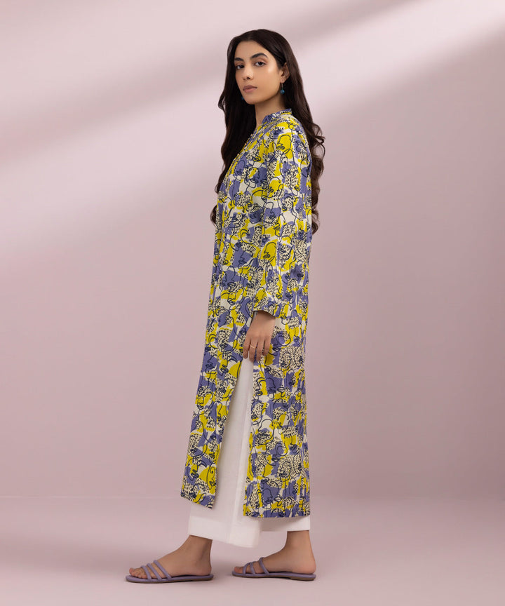 Printed Front, Printed Back, Full Sleeves, Band Neckline with a placket