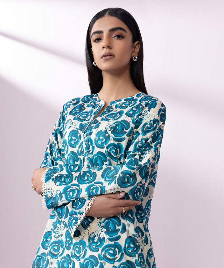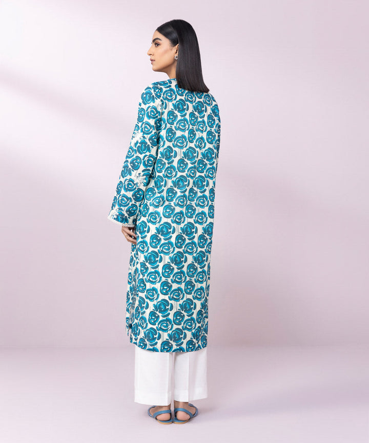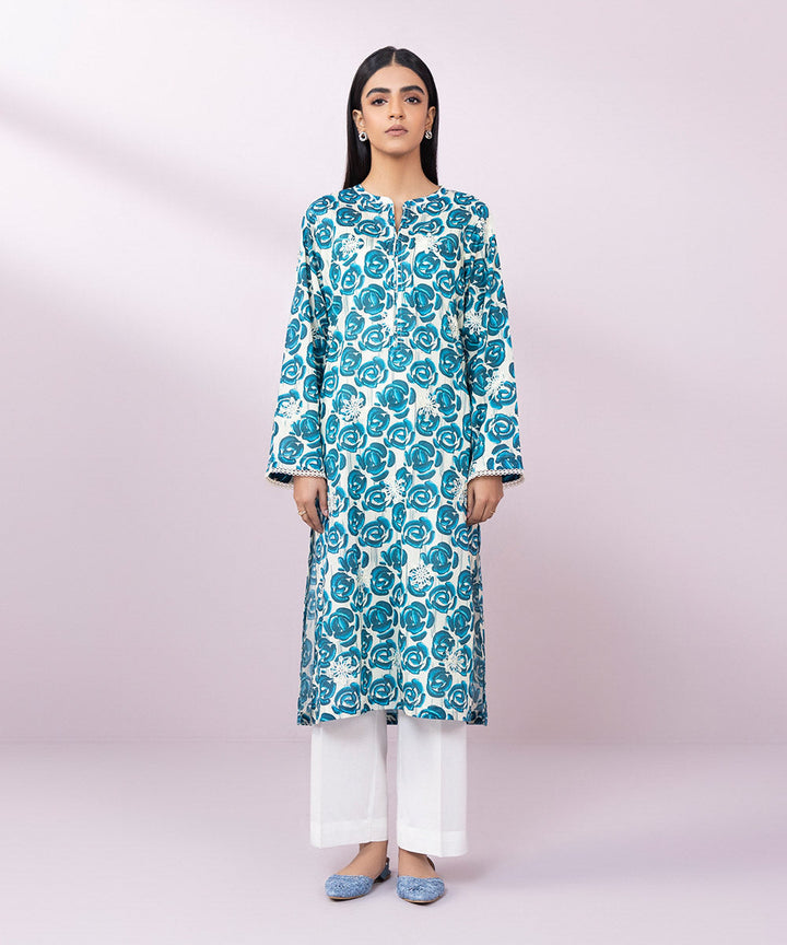 Printed Front with Embroidery, Printed Back, Full Sleeves, Band Neckline with a slit