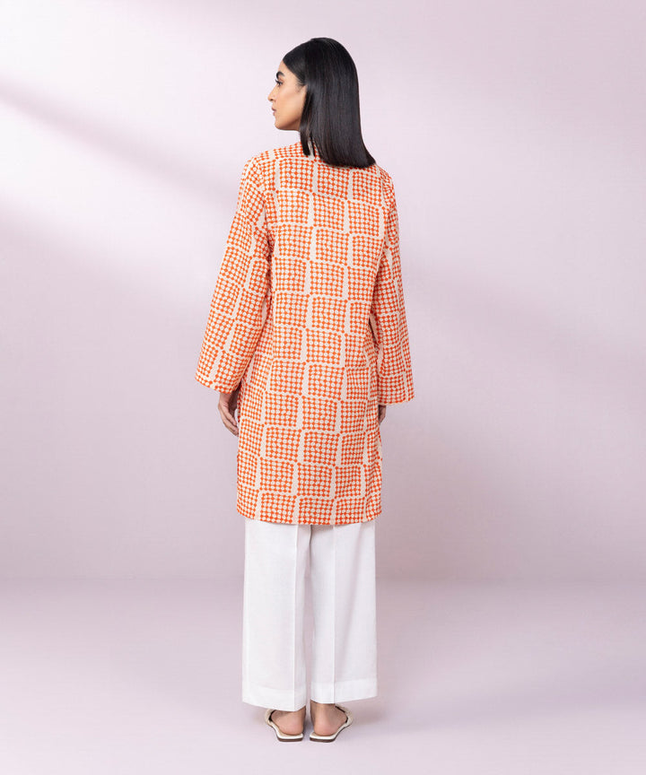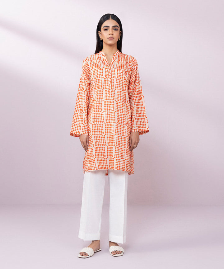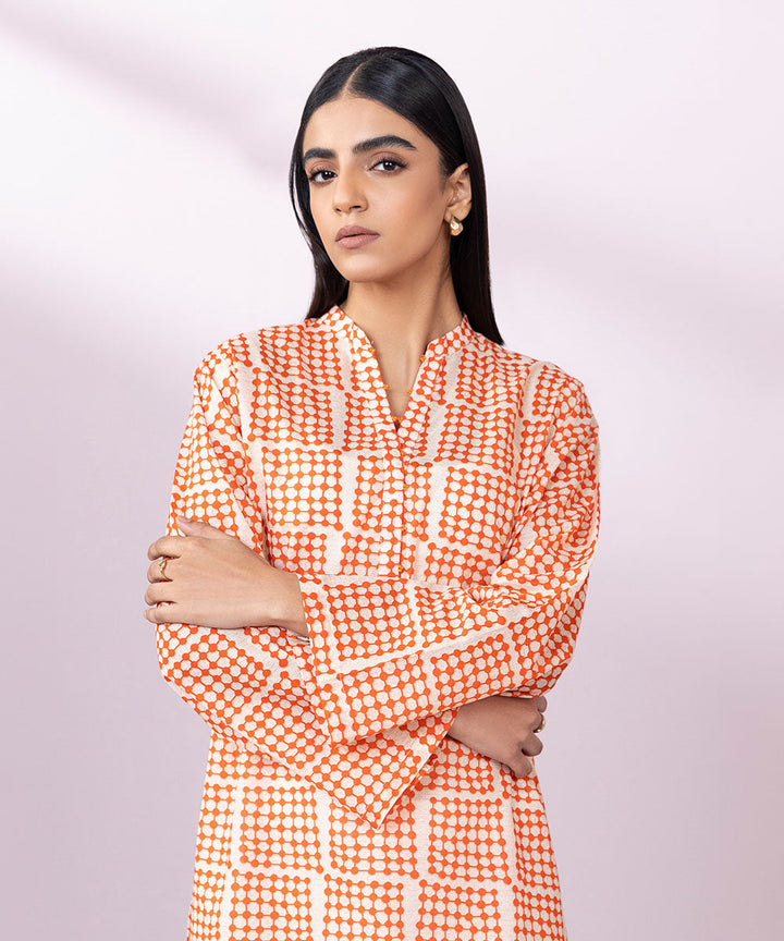 Elevate your style in our beige & orange intricately illustrated straight silhouette.