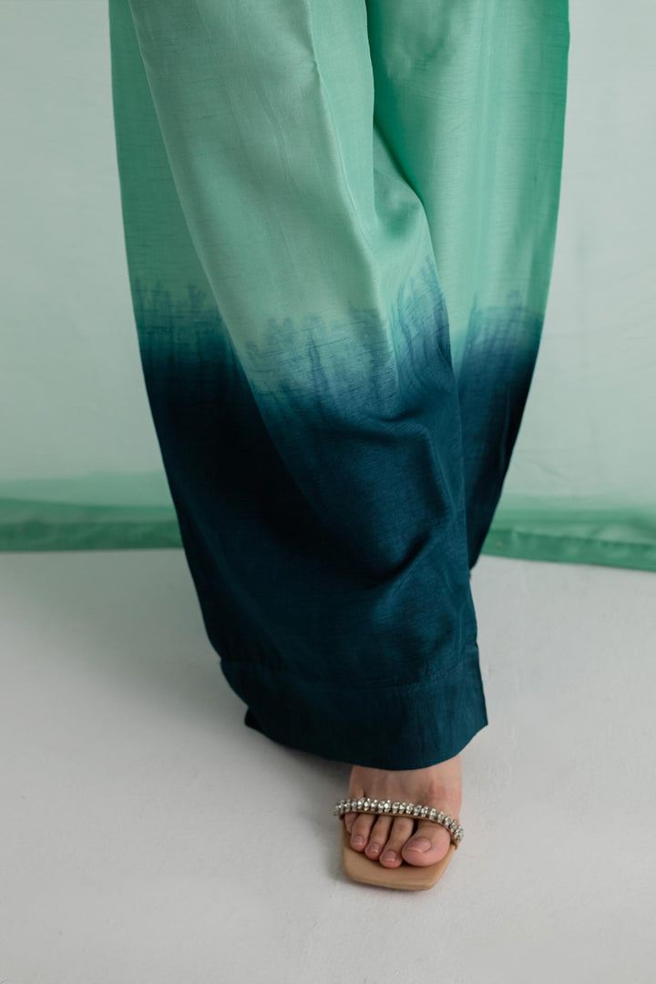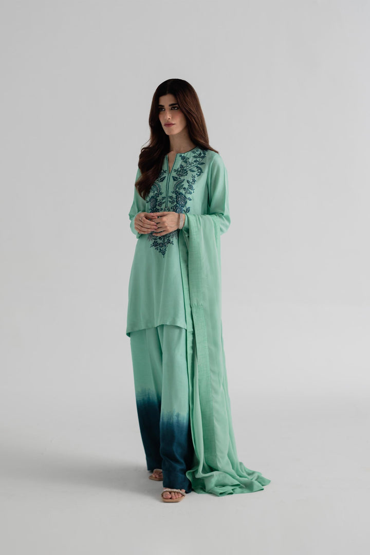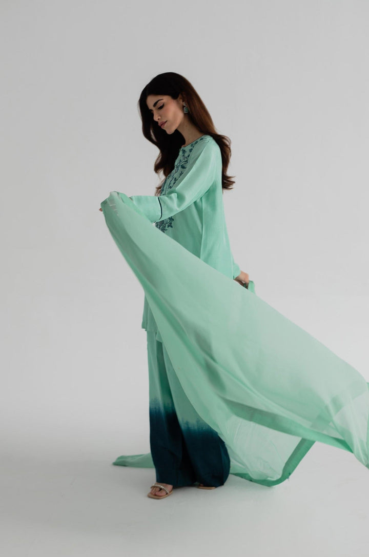 Short kurta in mint green elevated with gara neckline and crystal work. Paired with a dip dyed loose fit shalwar and dupatta.
