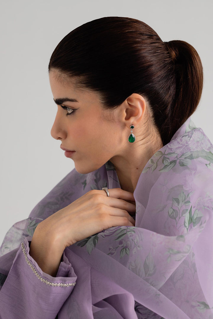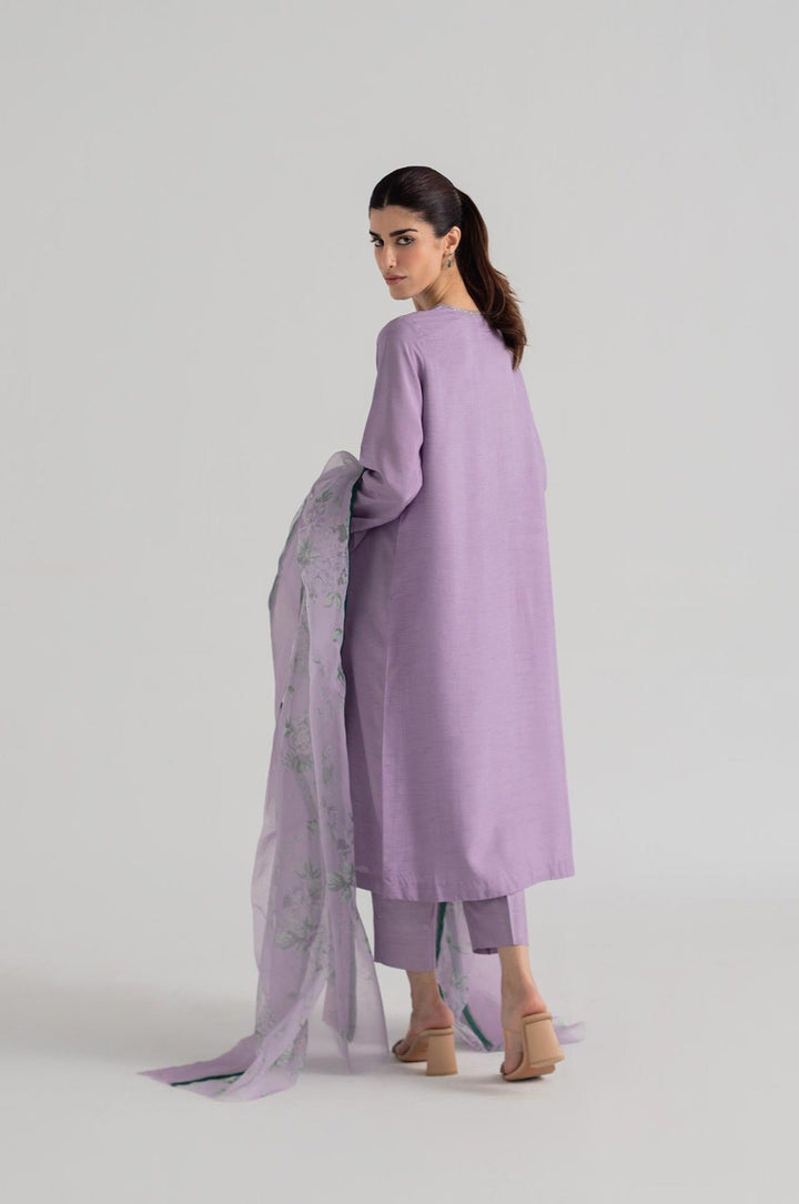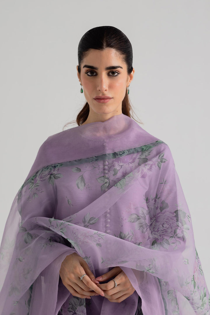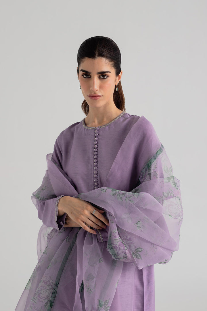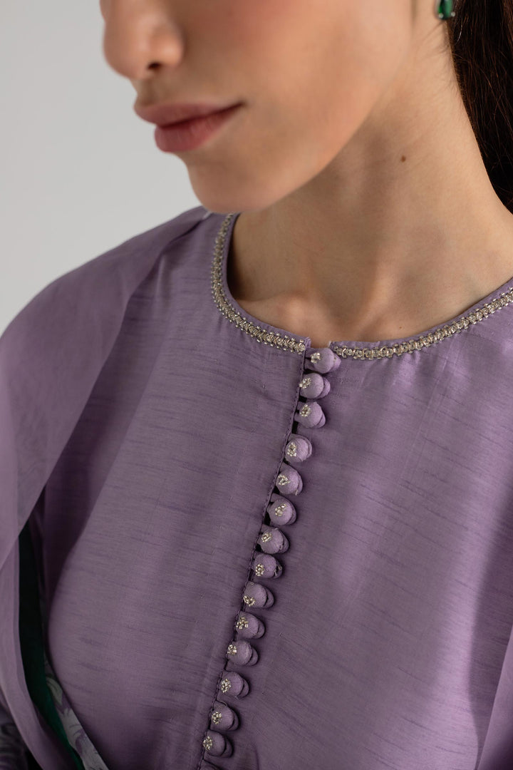 Plain lavender kurta with crystal work on the neckline and sleeves, paired with cropped pants and a floral dupatta.