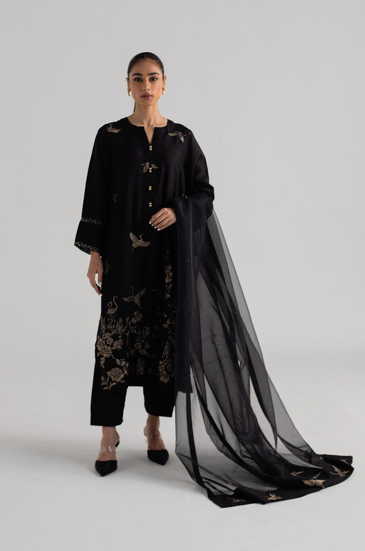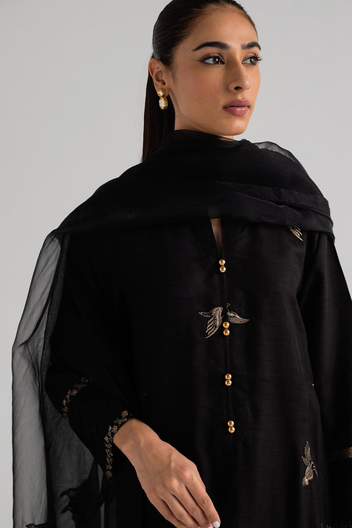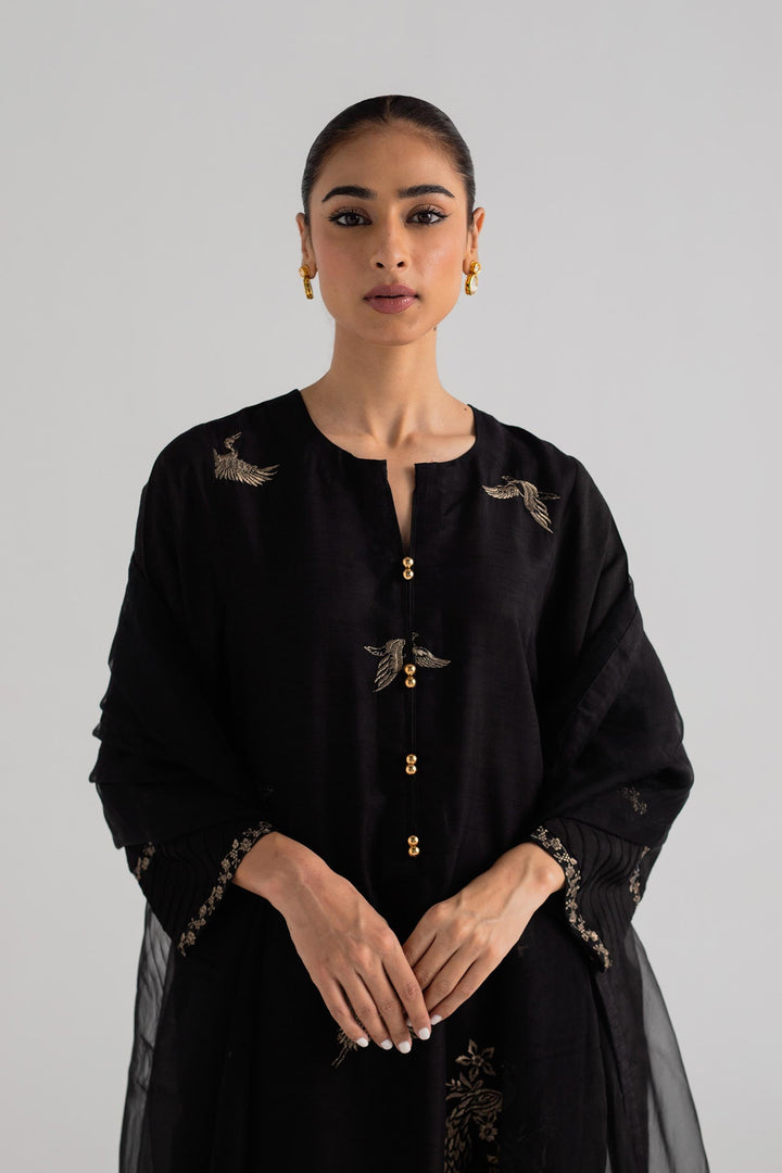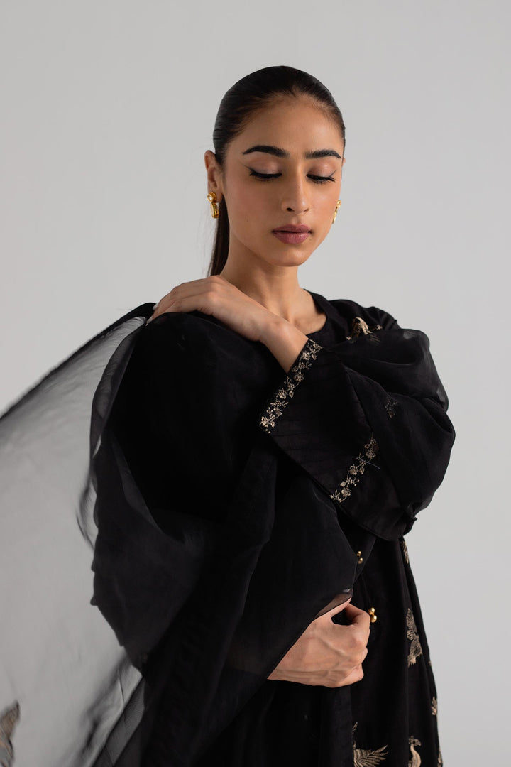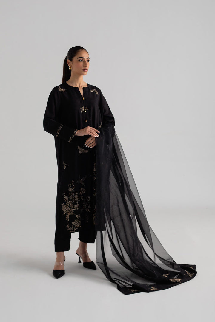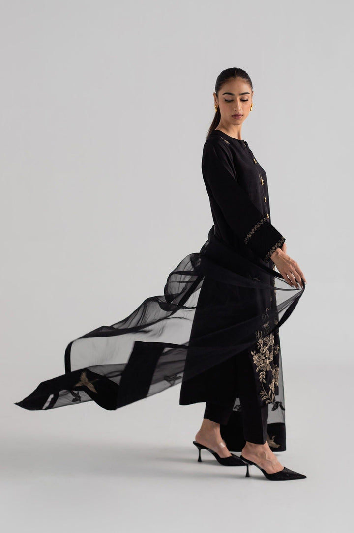 Black long shirt with embroidery on its front, paired with a shalwar and dupatta.