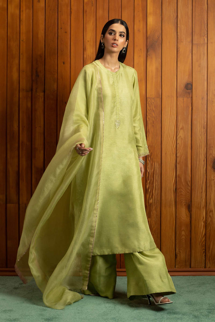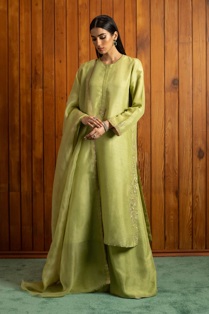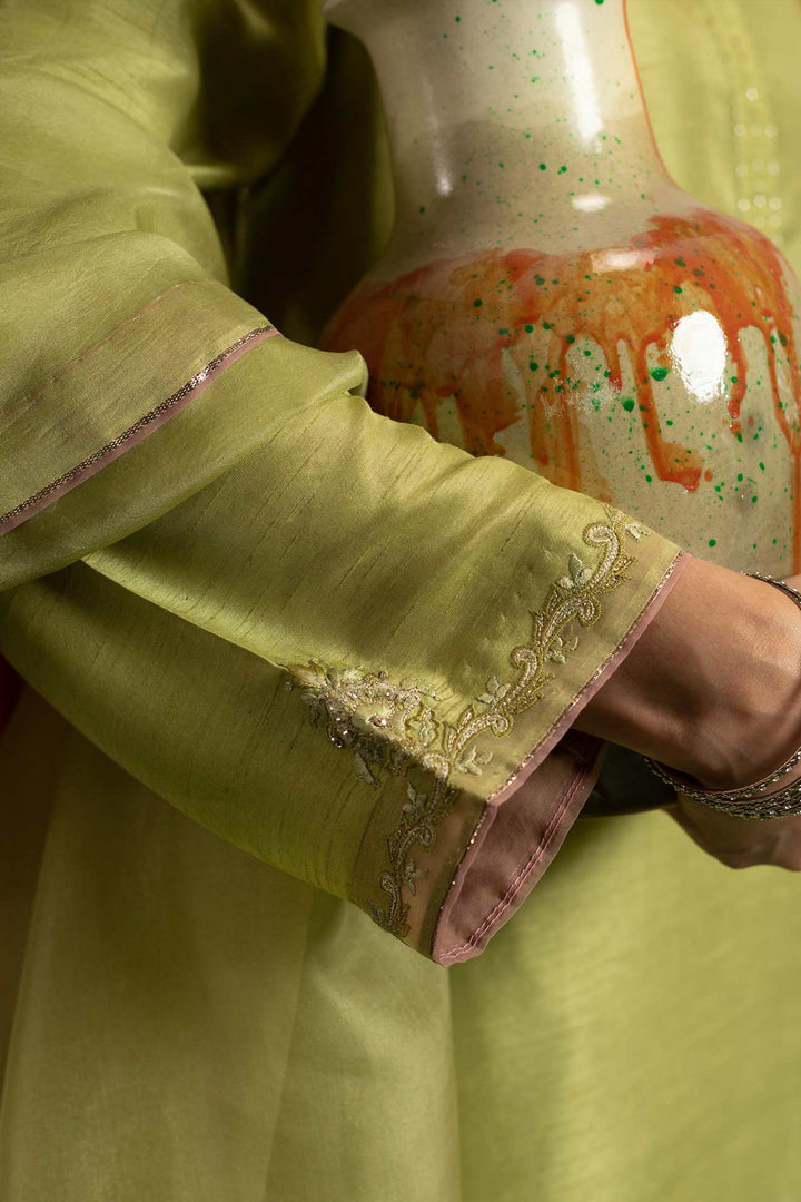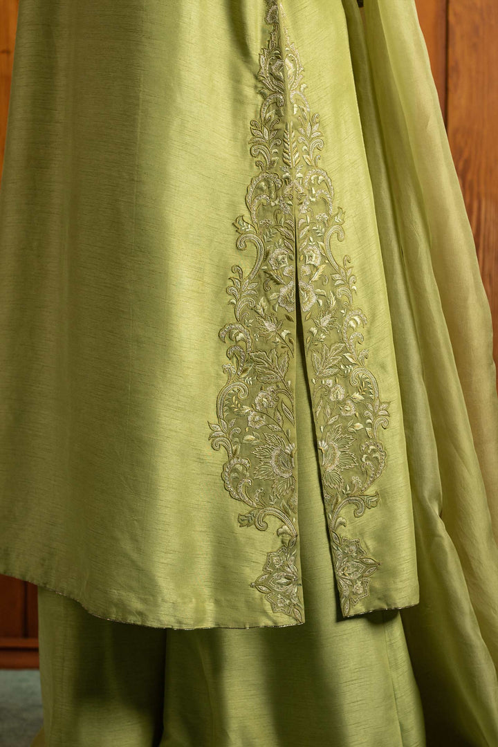 Pistachio green kurta with embroidered side seams and sleeves, enhanced with adda work. Paired with sharara pants and a dupatta.