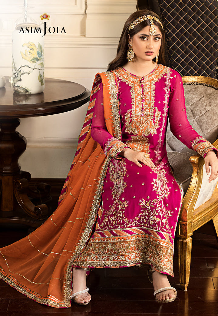 Be mesmerized by the vibrant fuchsia ensemble from the ‘Jhilmil Collection’ by Asim Jofa! Brighten your wardrobe with meticulous zari-work that creates a pattern of elegance, and a graceful border that reflects timeless beauty, it comes with a tangerine dupatta that adds a dash of lively charm. Channel the enchanting spirit of Sajal Aly and dazzle everyone, creating a lasting impression of awe and admiration.