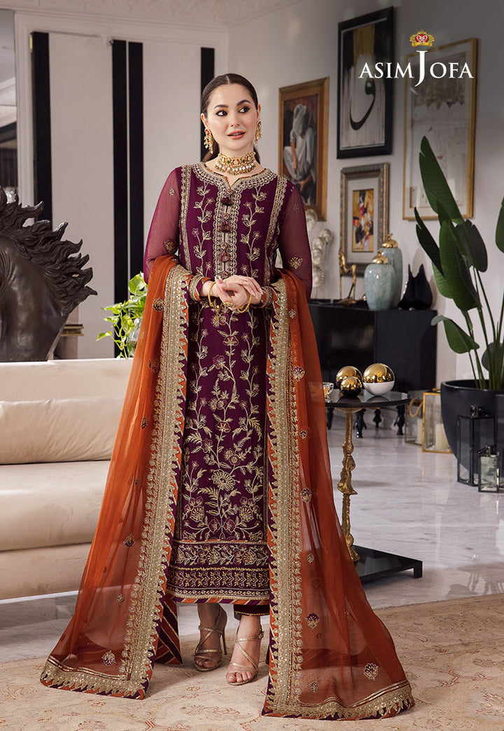 Prepare to embark on a journey of enthralling glamour with this plum number. Adorned with golden sequins and intricate deep plum and rust threadwork, this ensemble exudes an air of timeless regality. To complete the look, a rust dupatta graced with a grand four-sided border adds the perfect finishing touch. Experience the allure of plum and the magic of exquisite craftsmanship all in one.