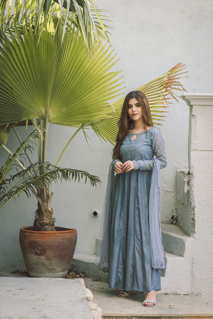 | Embroidered bodice with full length dress paired with tulle net dupata with hem detailing. |