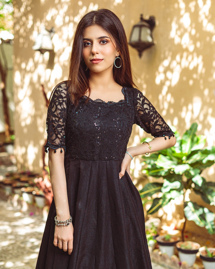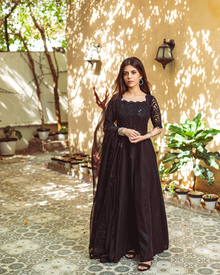 Beautifully crafted classic black color Kalidaar with net bodice, pearl detailing on sleeves paired with chiffon dupatta.