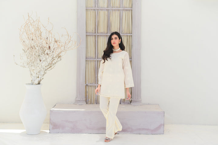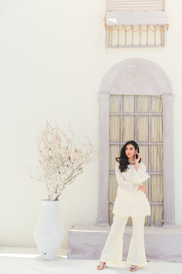 The off white chikenkaari kurta paired with bellbottom pants is an ensemble that combines traditional craftsmanship with a touch of contemporary made from fine fabric cotton. The highlight of this ensemble is the intricate hand-embroidered chiken floral motifs and mirror work lace adorning the fabric. Delicate and finely detailed, these embroidery patterns are crafted with expert precision.