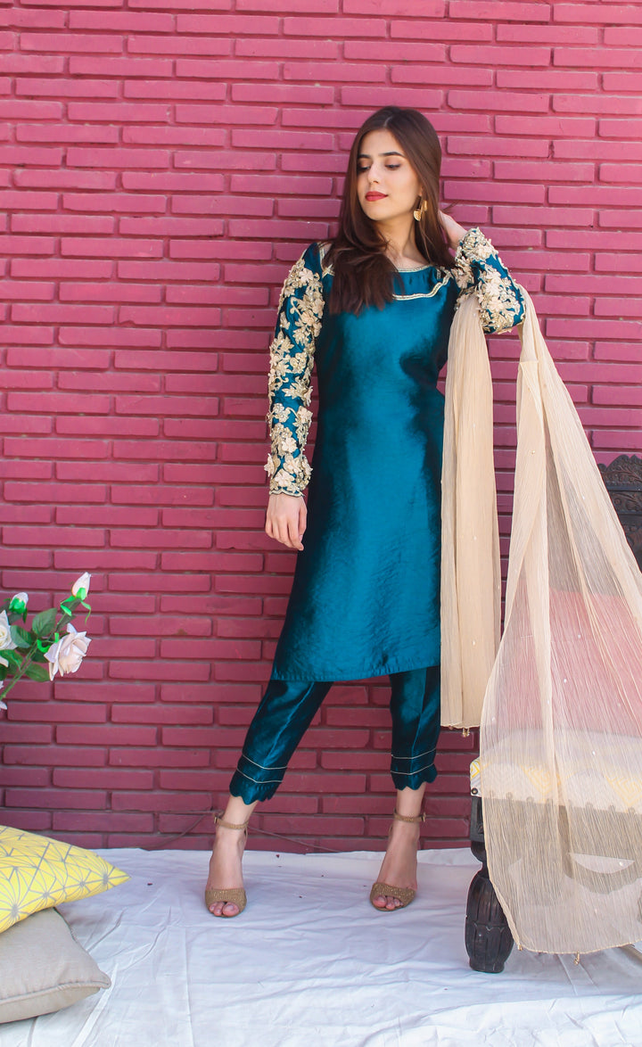 | Two piece formal set with embellished sleeves and details on the neckline, paired with a golden duppatta. |