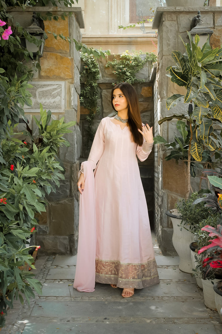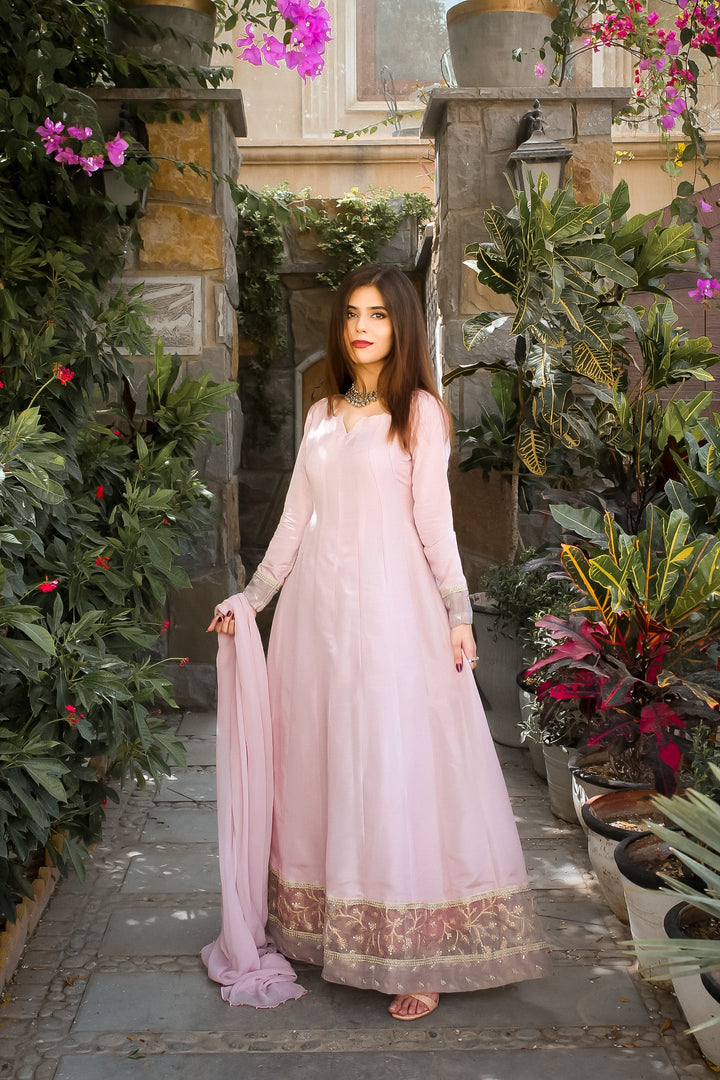Perfect muave lilac shades of this summer in our full length Kalidaar with double embrioded borders on hemline and on sleeves paired with chiffon duppata.