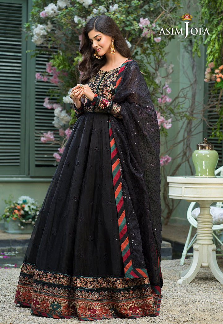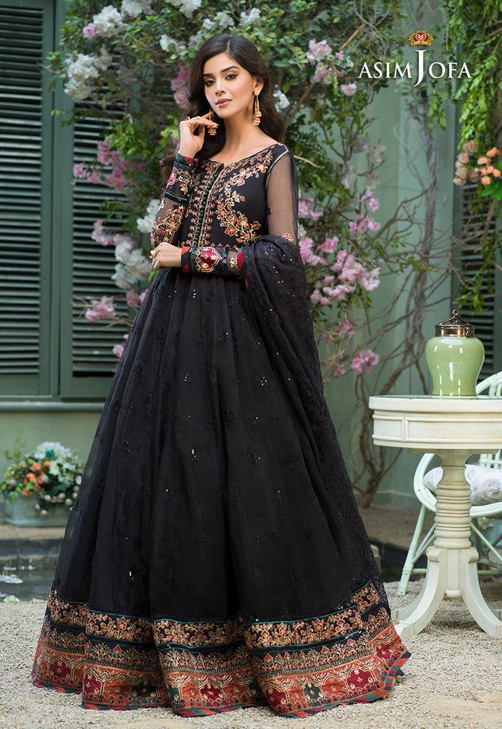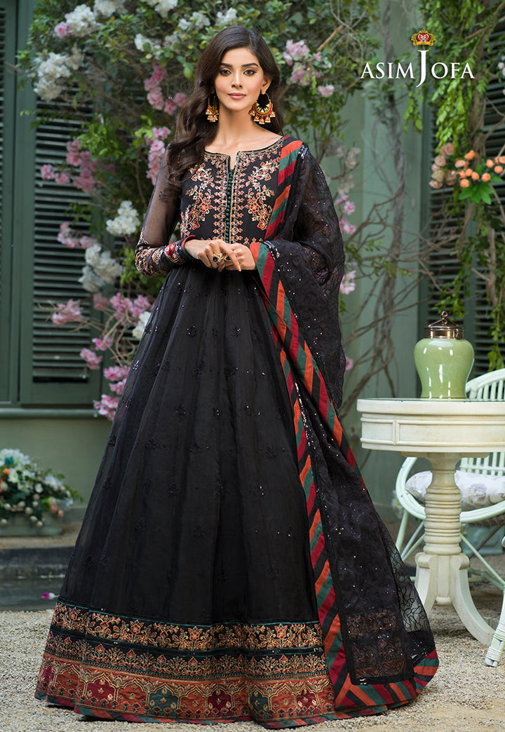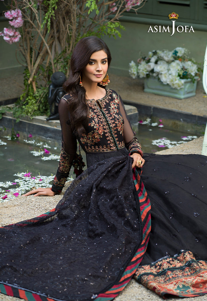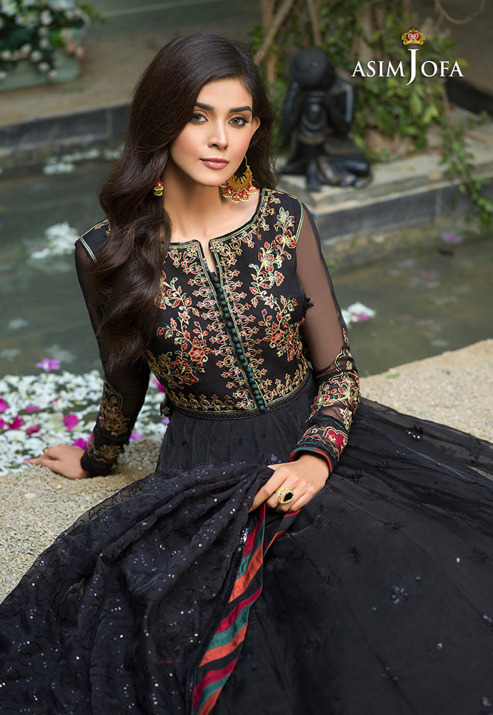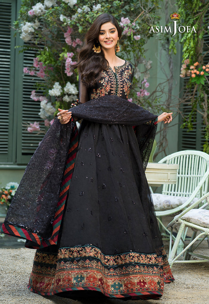 She looks stunning in this new avatar, Zainab Shabbir is a sight to behold in this obsidian design. Black organza becomes the base, bodice is made in colorful threads and kalis are worked in black thread and sequins bordered with chataptti style embroidery in a combination of rust, dull green and maroon threads creating a beautiful hemline. The dupatta is sprinkled with sequins embroidered in a random repeat giving it a glittering effect. It comes with dyed cambric pants.