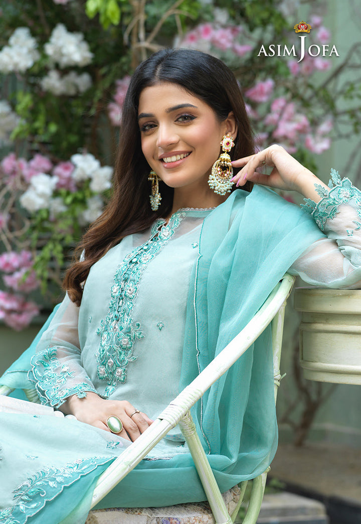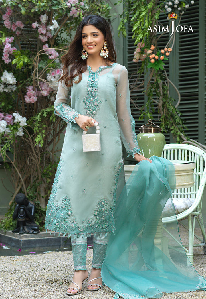 As fresh as morning dew Laiba gives off a soothing vibe donning this delicate design. On sheer organza mint monotonous color scheme is at work with threads highlighted by silver zari, lorex and mirror inserts giving it an edge above all. The shirt is pale mint bordered by dark mint organza L shaped side slits and daaman with details on sleeve hem and neckline. The dupatta is bordered with a geometric scallop pattern accentuated by embroidered corners glinting with mirrors. A solid cotton silk trouser rounds off the look of this design.