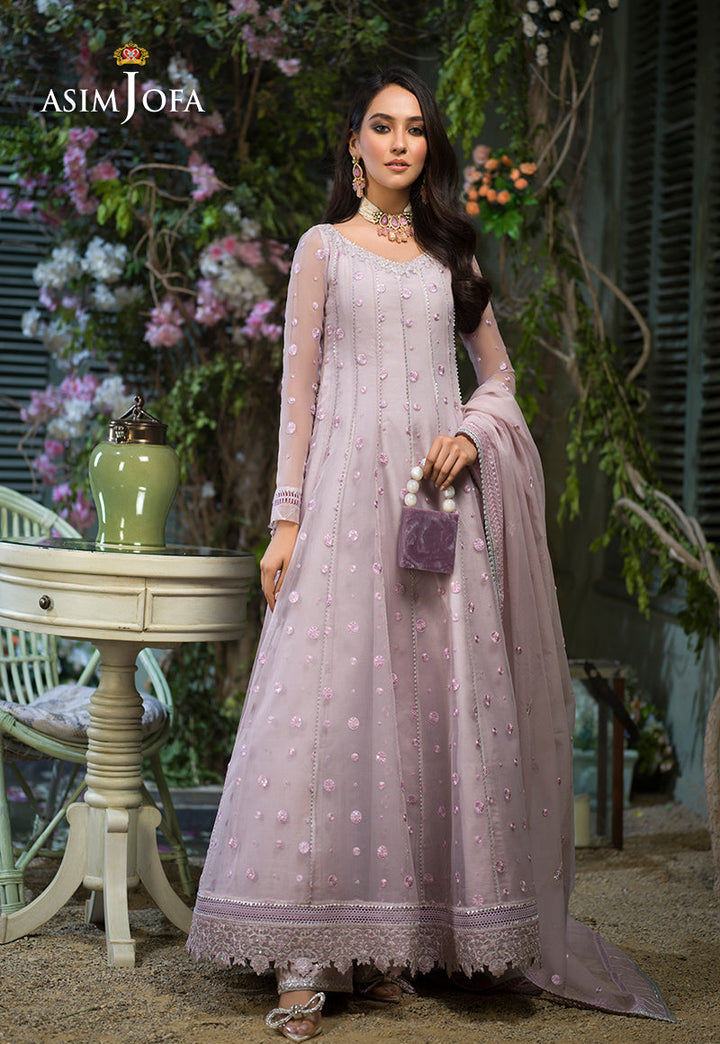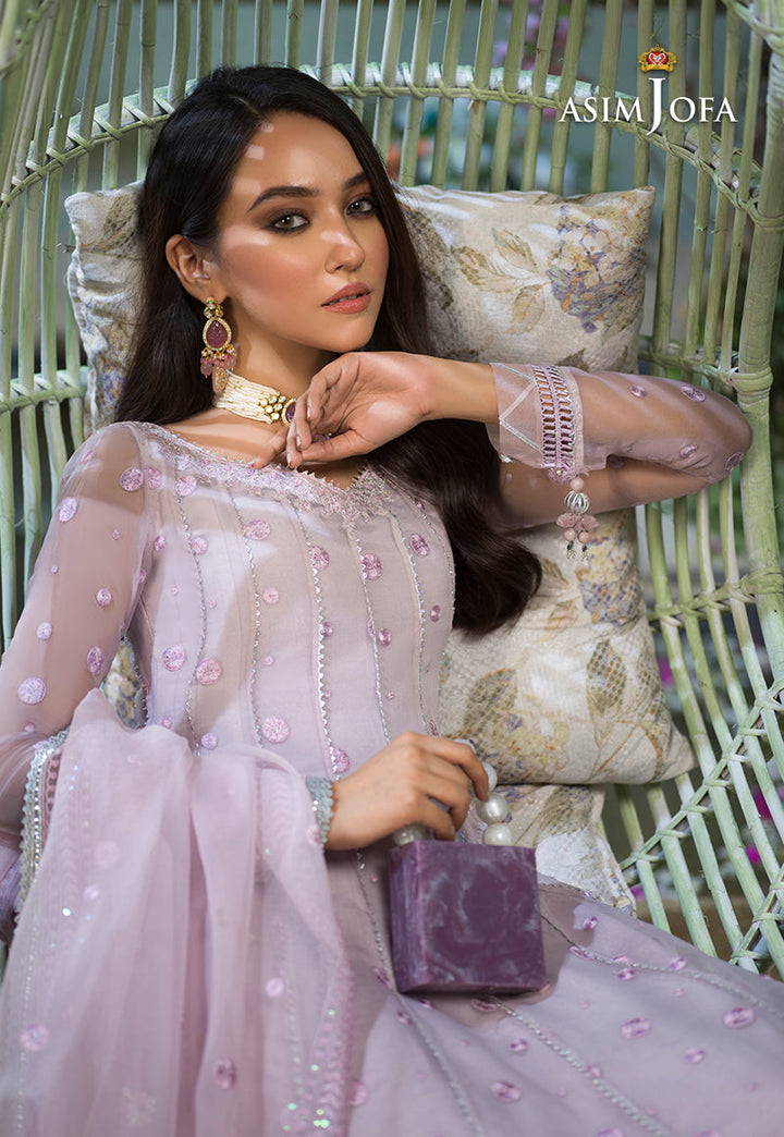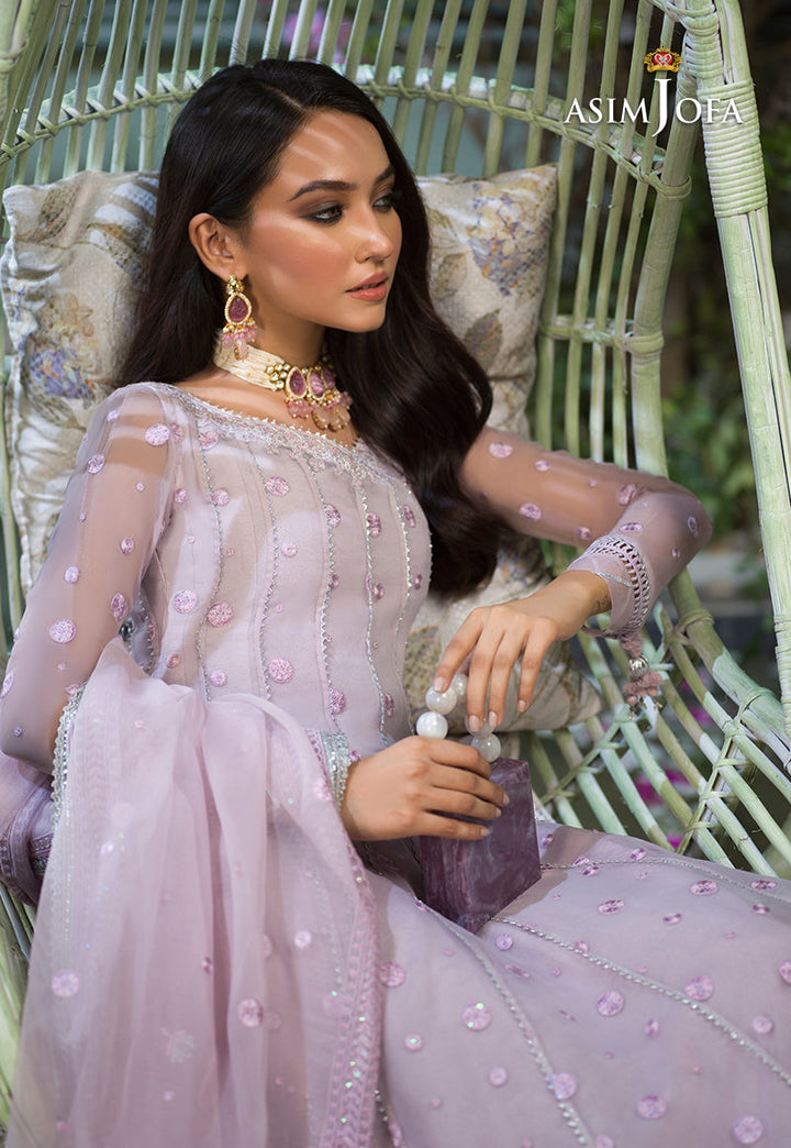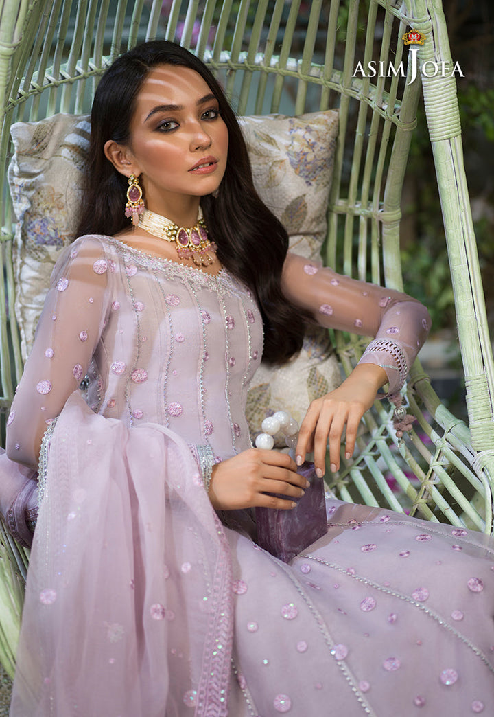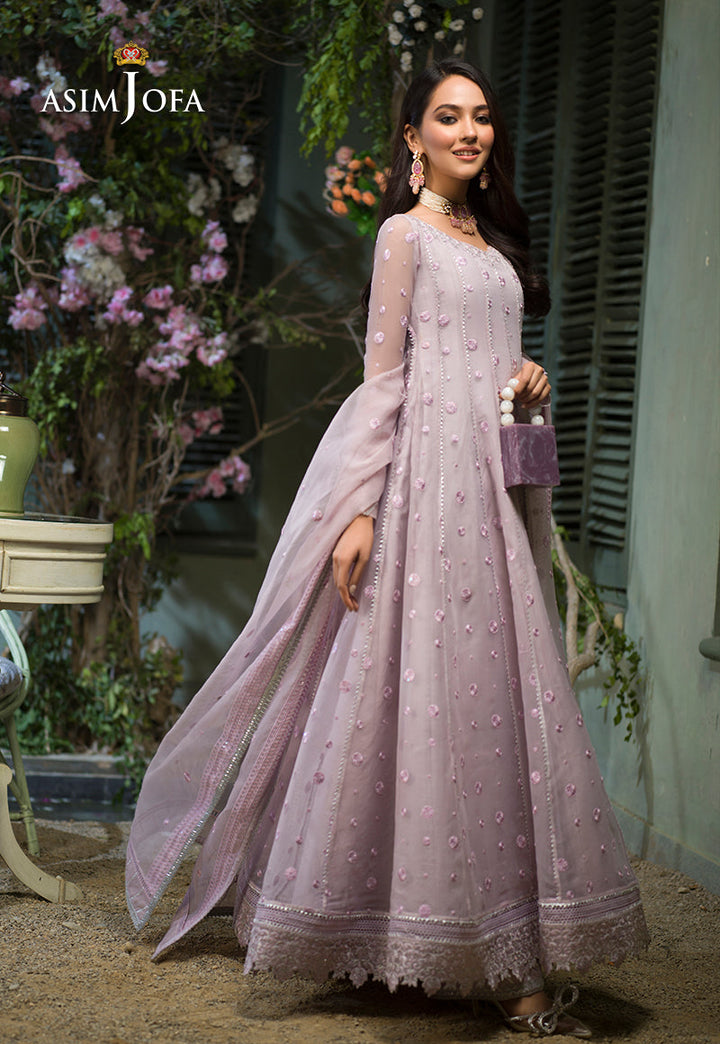 Breathing a life into this design Sidra Rajput is an epitome of dainty beauty. Pastel lilac organza is draped in polka dot patterned twinkling with luminous sequins fashioned into a kalidaar trimmed in a floral floral border on hemline. It comes with a heavily embellished dupatta and dyed cotton silk pants.