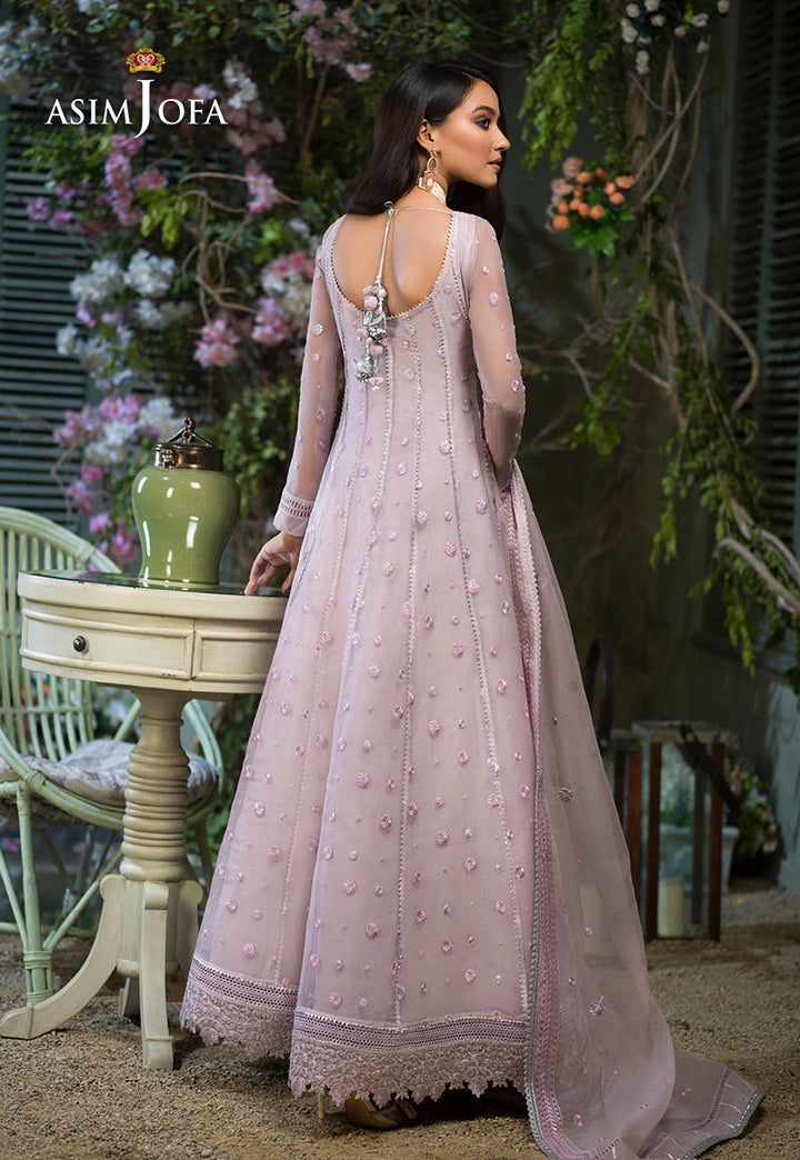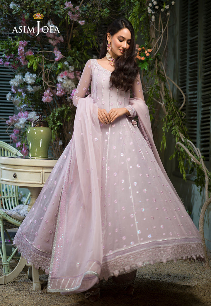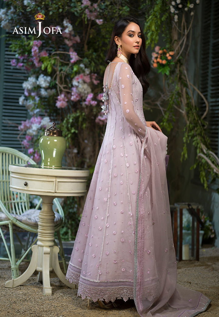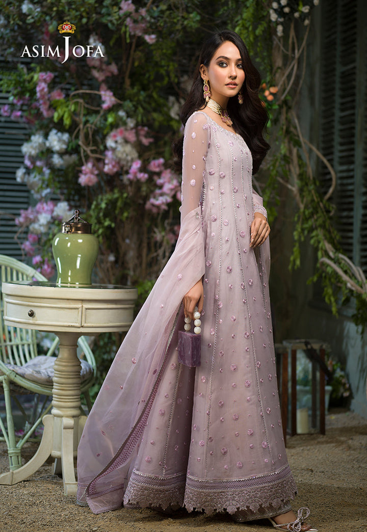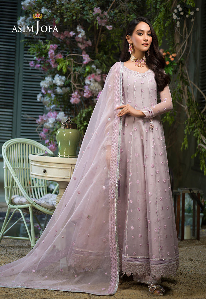 Breathing a life into this design Sidra Rajput is an epitome of dainty beauty. Pastel lilac organza is draped in polka dot patterned twinkling with luminous sequins fashioned into a kalidaar trimmed in a floral floral border on hemline. It comes with a heavily embellished dupatta and dyed cotton silk pants.