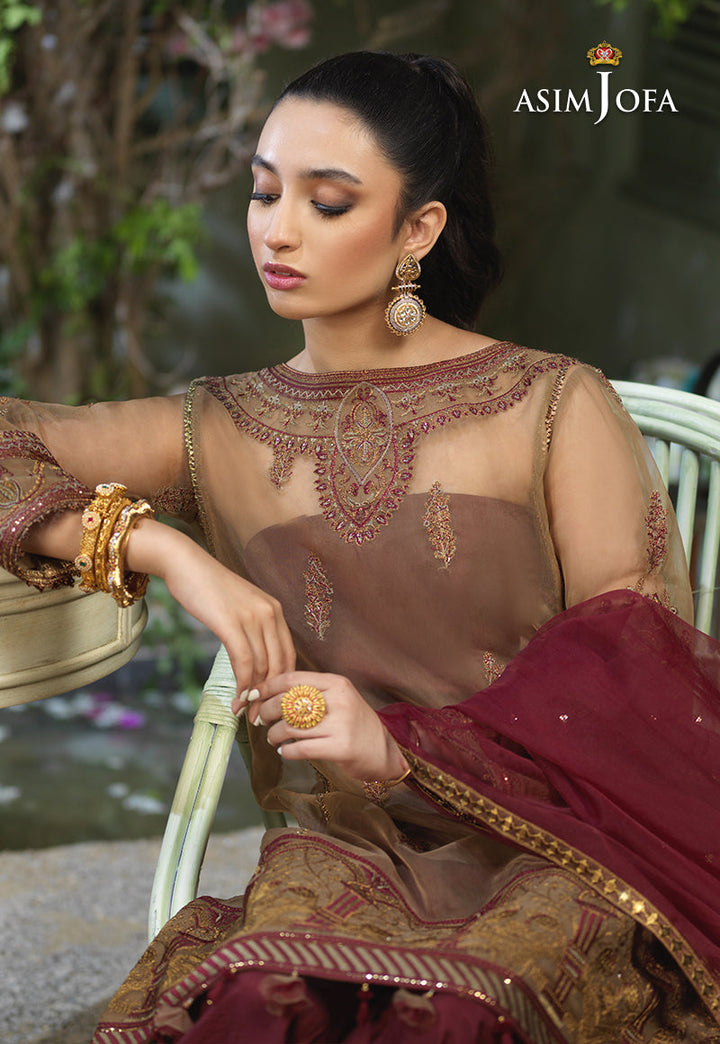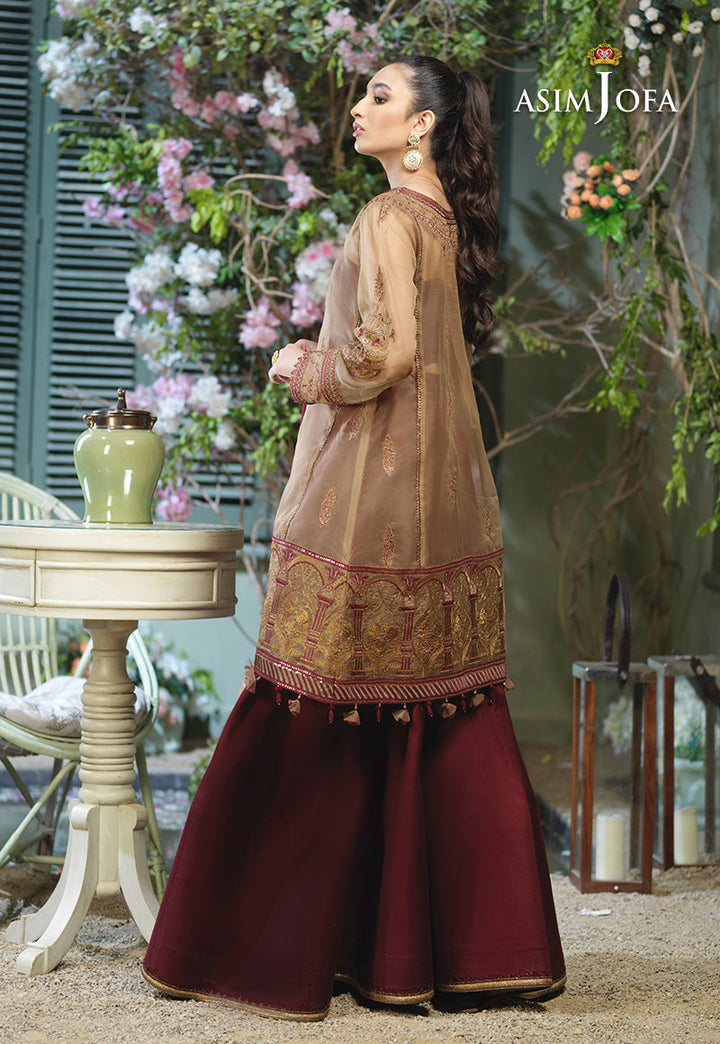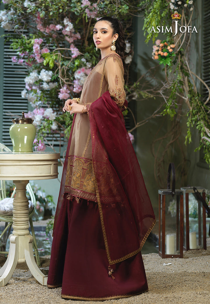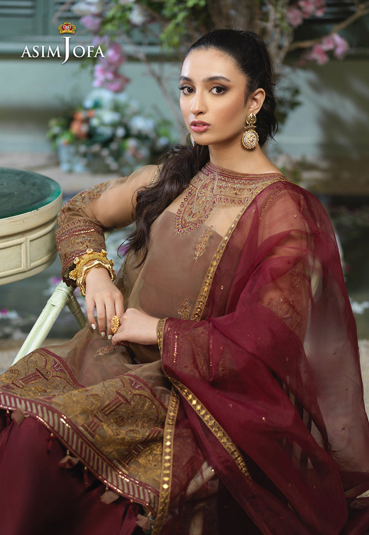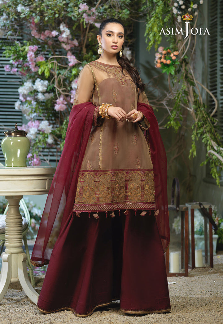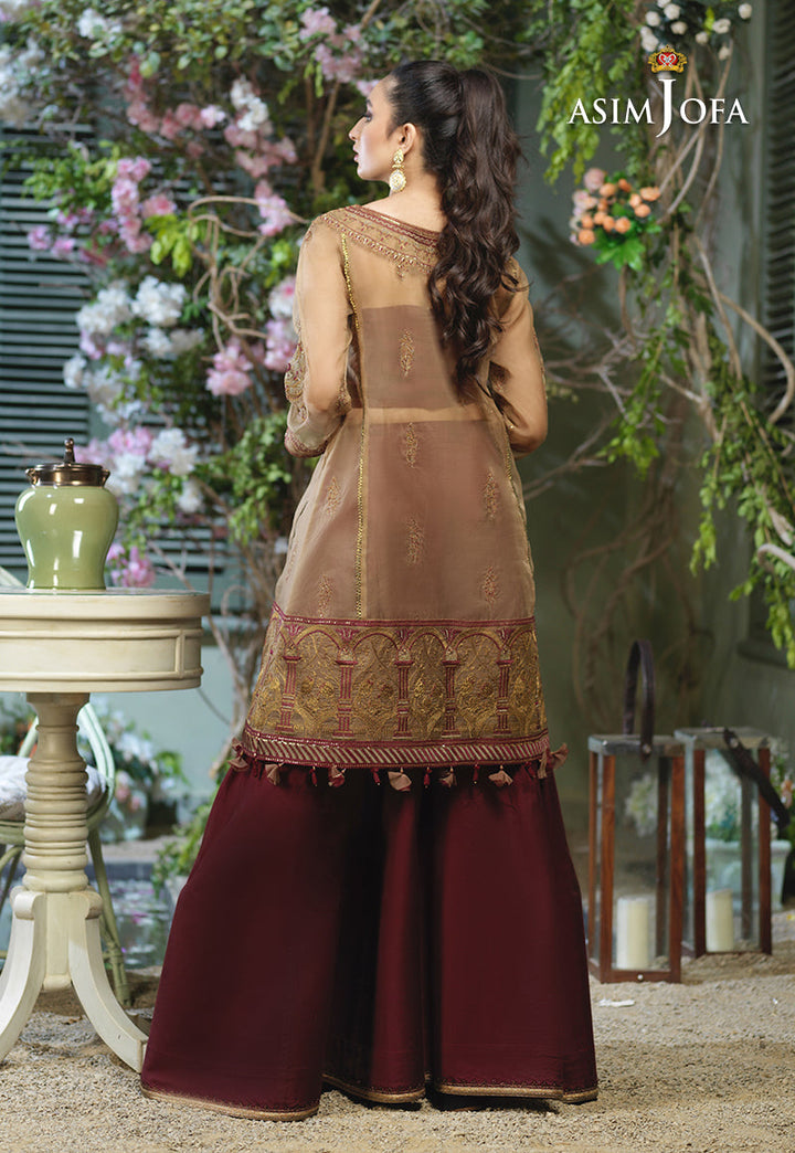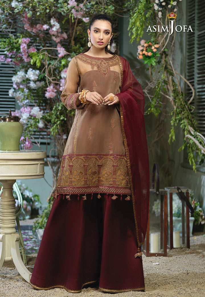 Taking the style quotient up Ayla slays in this chic design. A loose silhouette shirt embroidered in antique gold with hints of maroon. The shirt is adorned with front back neckline and heavily bordered in figurative detail with dori, thread and zari hinted with sequins. It is paired with deep maroon cotton silk Dhaka pajama making this design a trendy choice for your next festive event.