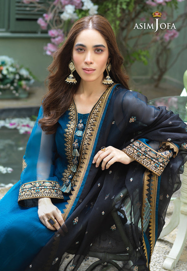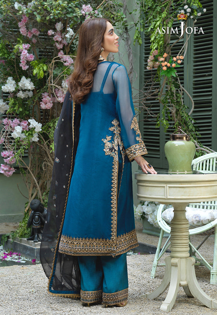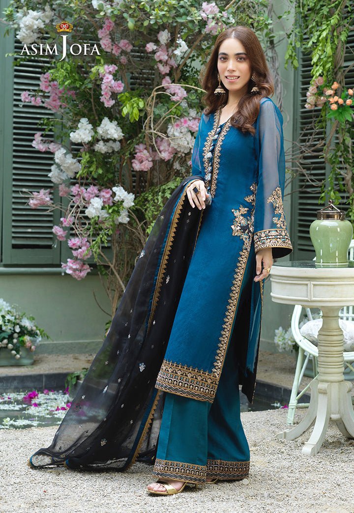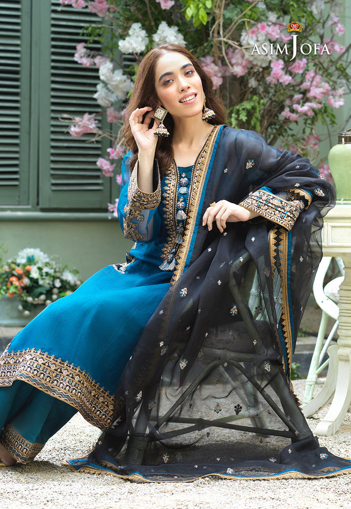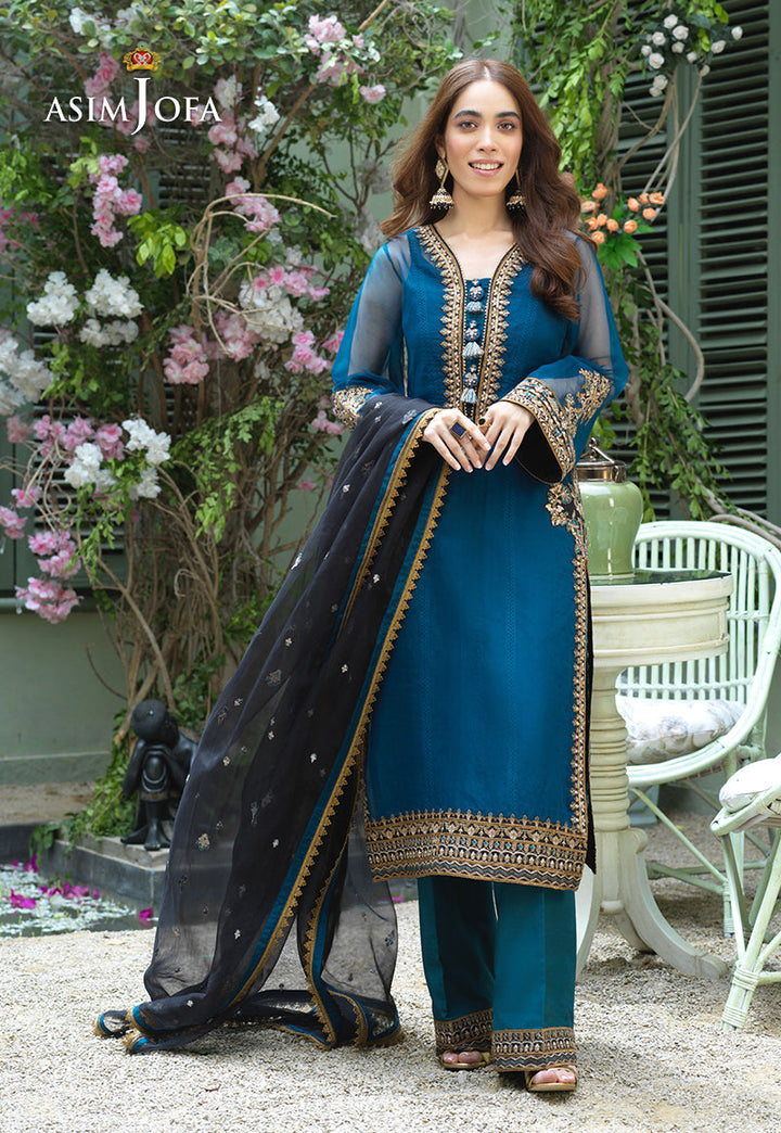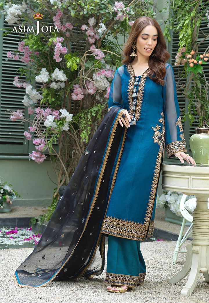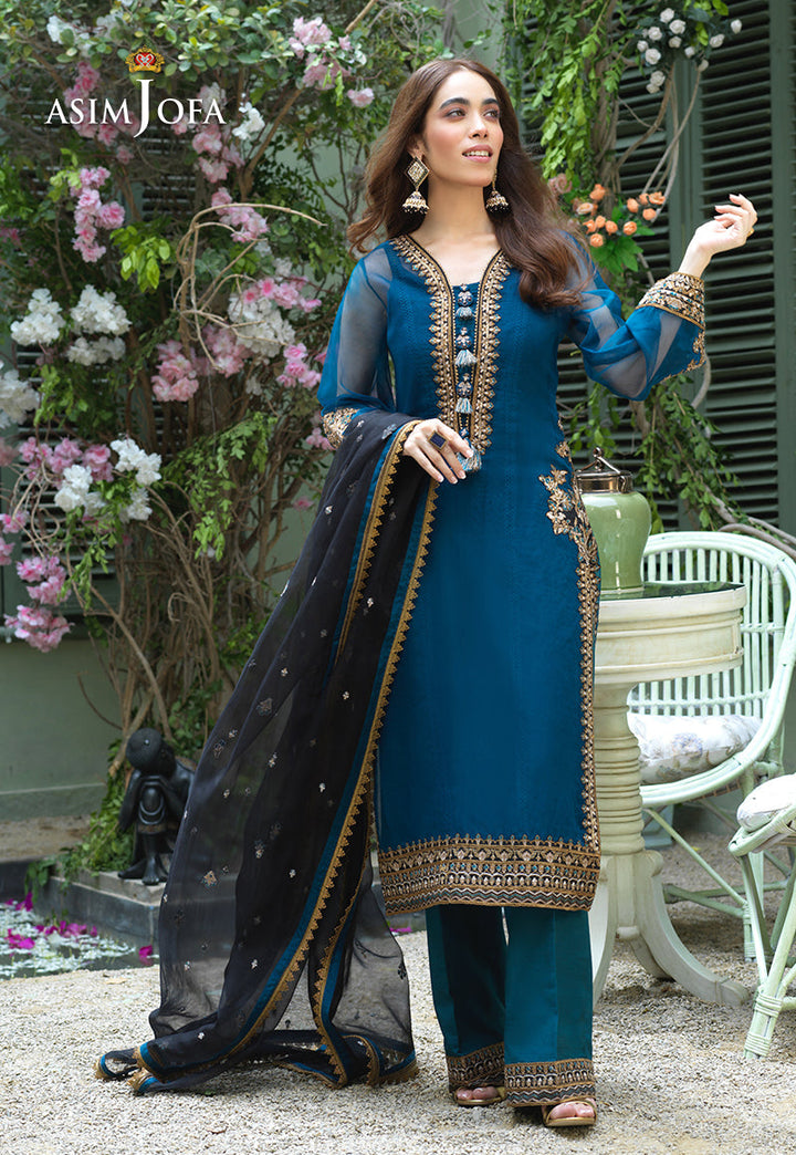 This beautiful deep teal ensemble is adorned with antique gold dori with filigree threadwork. The sleek shirt is bordered with appliqued sides and neckline on black color. The dupatta is embroidered in heavy chan with a mix of big and small motifs. Same colored silk pants are decked with a heavy hemline border. This design is a must have for this festive season.