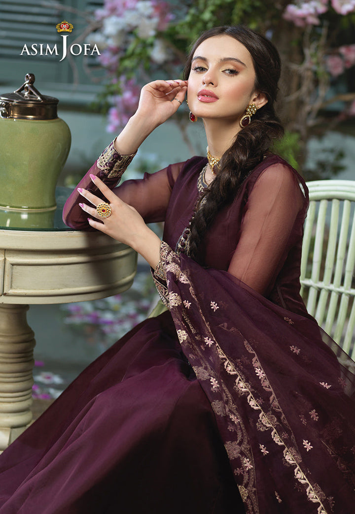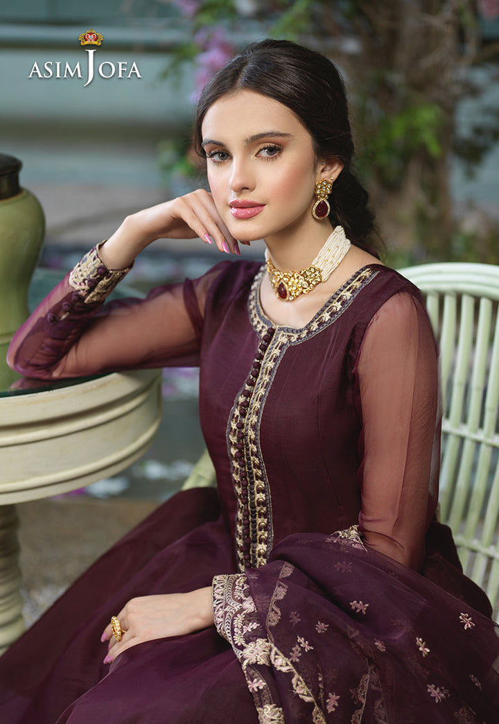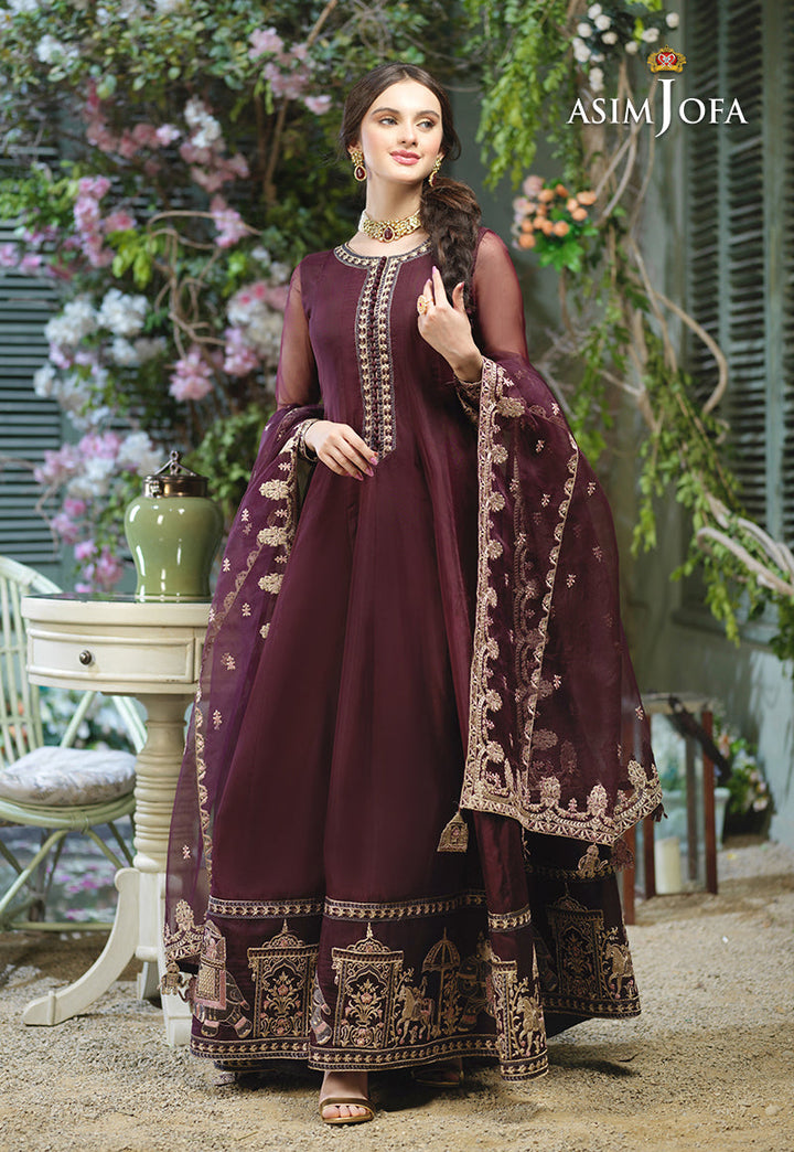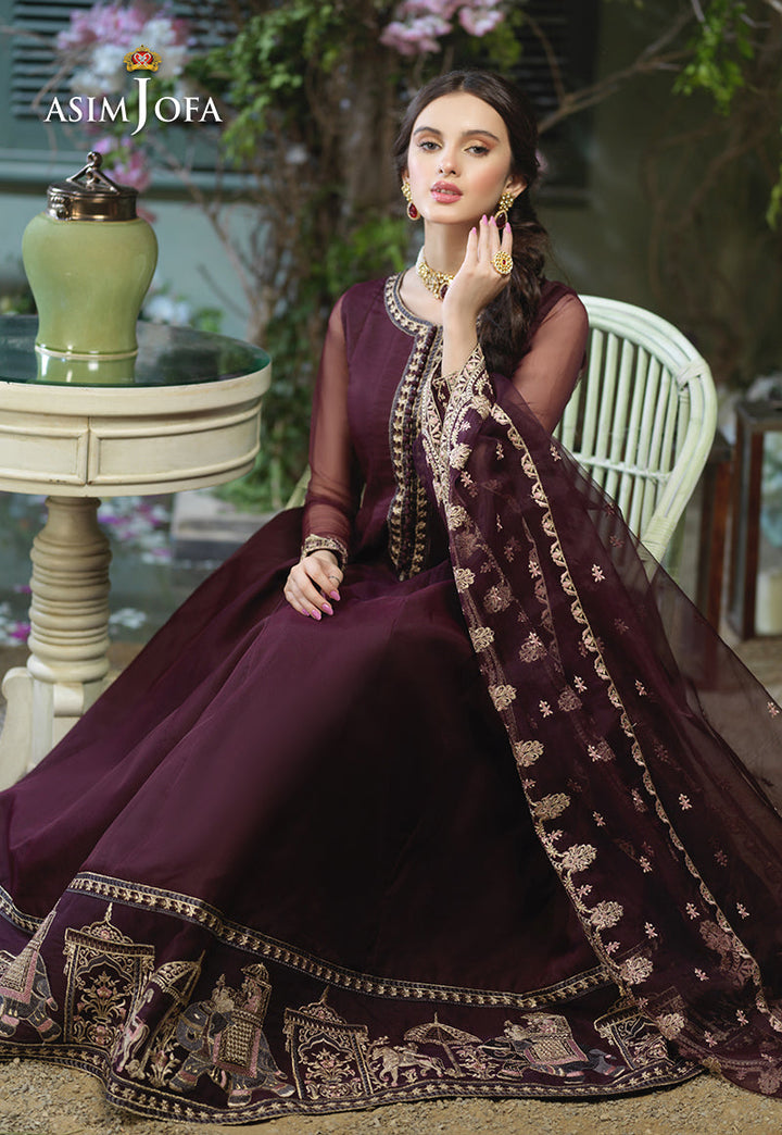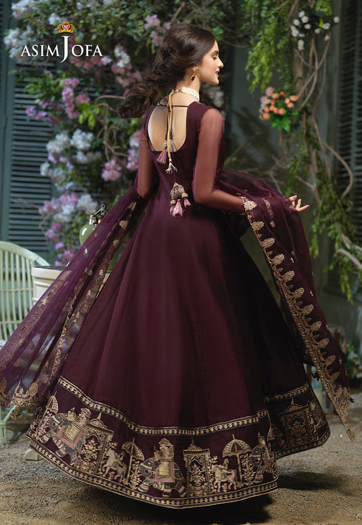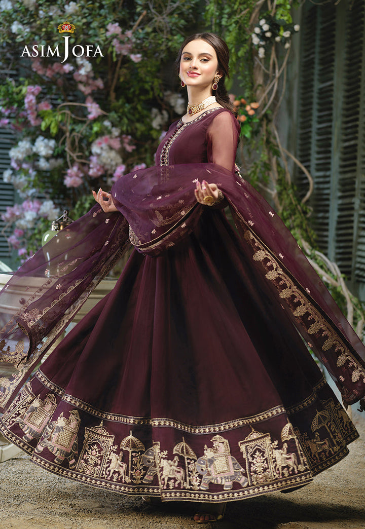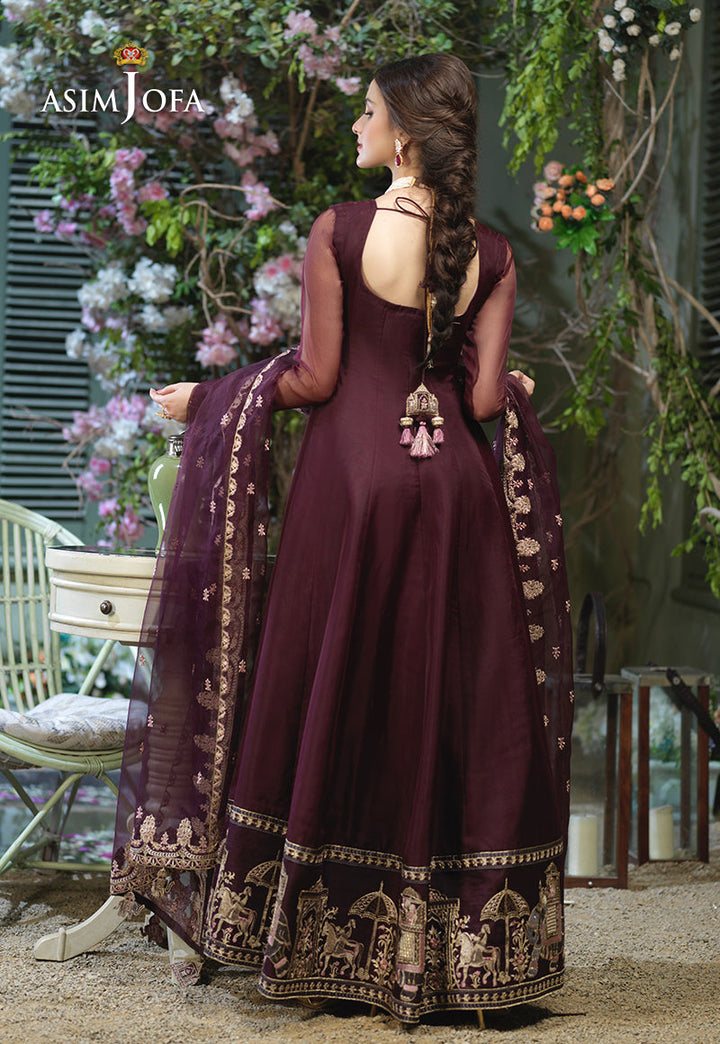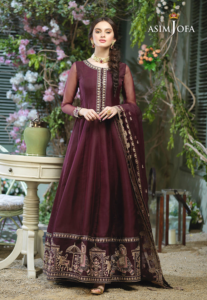 It is a unique design worn by lovely Mahnoor, with her flawless beauty and effortless charm. A plum kalidaar trimmed with heavily embroidered border in the form of a Mughal procession with decorated elephants and horses astride giving this design a royal touch. The dupatta is a sight to behold with its heavy embroidery complementing the overall look of this stunning shirt. Same colored cotton silk trouser comes with this compelling set.