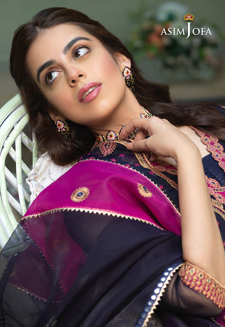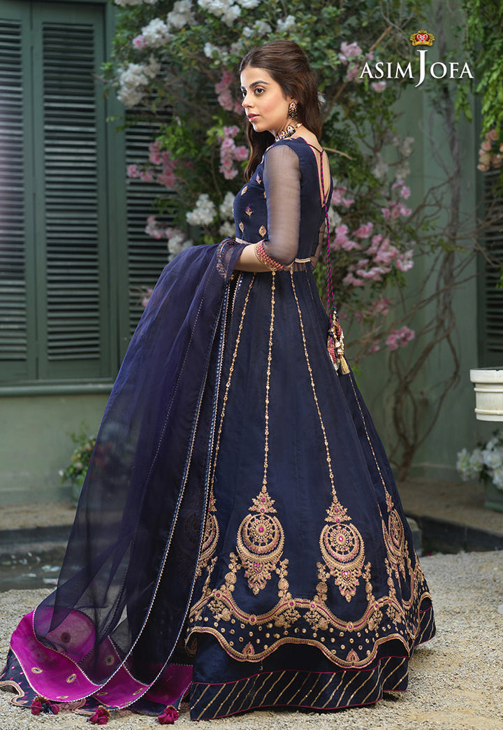A thing of beauty is a joy forever, Yashma rings this proverb true. Garbed in a navy blue peshwas inspired by ethnic chandelier style jewelry motifs etched in copper gold zari and 9mm sequins giving it a mirror work feel the hemline is made in scalloped style giving it a beautiful edge with embroidery.  Neckline is embroidered on deep fuchsia in a rani haar style. The dupatta involves two colors of organza the pallu is embroidered in scallop with embellished fuchsia inserts uplifting the design to another level. It comes with a solid dyed cotton silk lehnga.