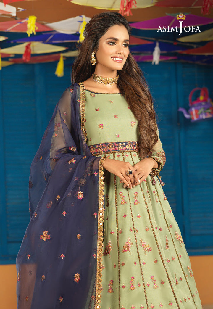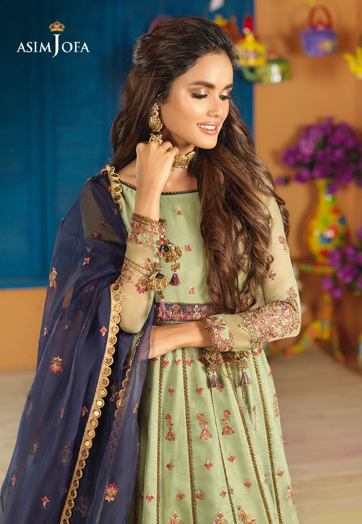 A mint green color pishwas with heavy ghair border makes up this royal ensemble. The accents of blue add a whimsical touch of modernity and playfulness to this timeless attire. The look is complete with embroidered organza dupatta in blue and a viscose raw silk secret pant.