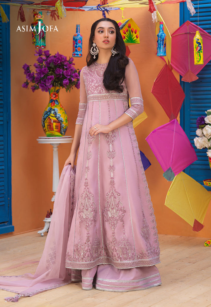 This stunning design can be crafted into a classic pishwas or an A-line flared kalidar as it comes with an accompanying bodice which has been perfectly sized to fit all measurements. It comes with an embroidered sleeves and 8 panels with exquisite climbing florals. There is an additional separate border for the hem which are an in a league of their own. Fully worked in contrasting colored threads with pani sitaras accompanied by a lush organza embroidered dupatta and with a raw silk trouser. This ensemble will make a grand statement this season and timelessly beyond.