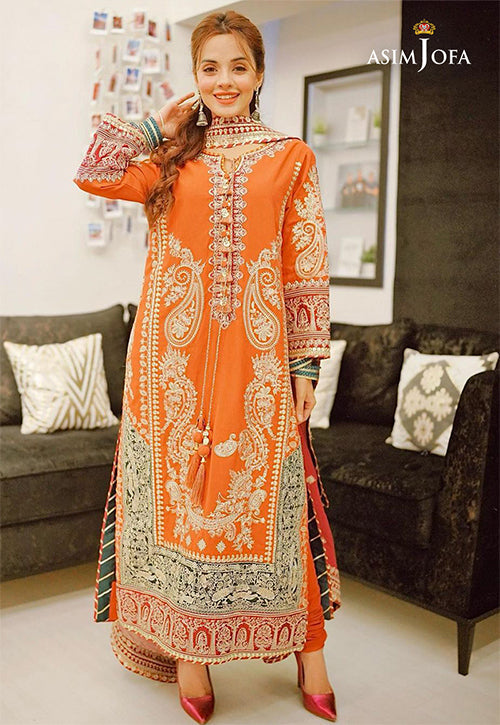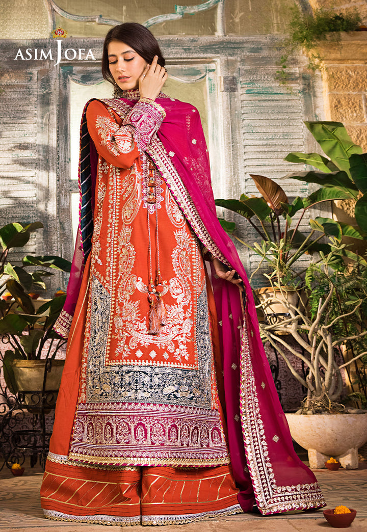 This eye catching orange piece is an apt metaphor for the beautiful hour of dusk. A heavily rendered shirt fashioned into center & side panels trimmed with contrasting silk borders topped with long necklines on front & back giving this design an edge above all. It features an elaborately embroidered fuchsia chiffon dupatta & solid dyed trouser.