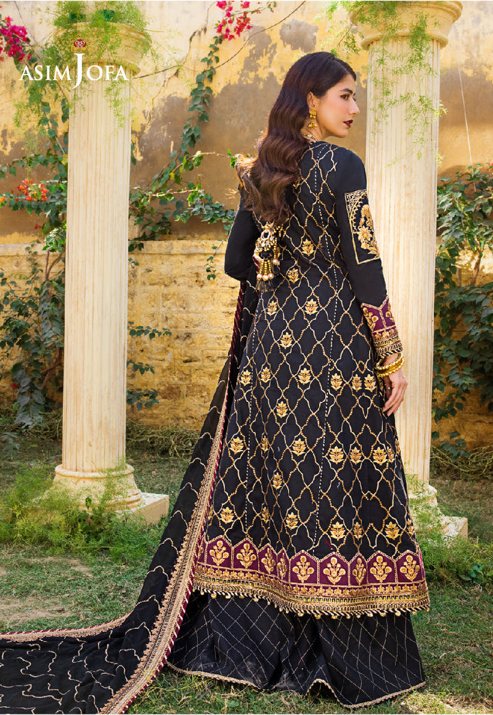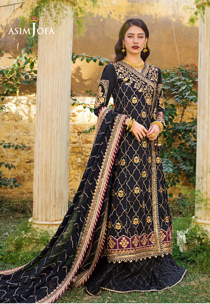 Syra Yousuf enchants dressed in this raven black gilded attire. A rare beautiful black angarkha is executed in copper gold zari, cupped sequins & lurex giving this design a distinct vintage feel. An ogee pattern with bold motif inserts on sleeves & deep maroon embroidered borders elevates it to another level. This design features an embroidered chiffon dupatta & solid dyed pants.