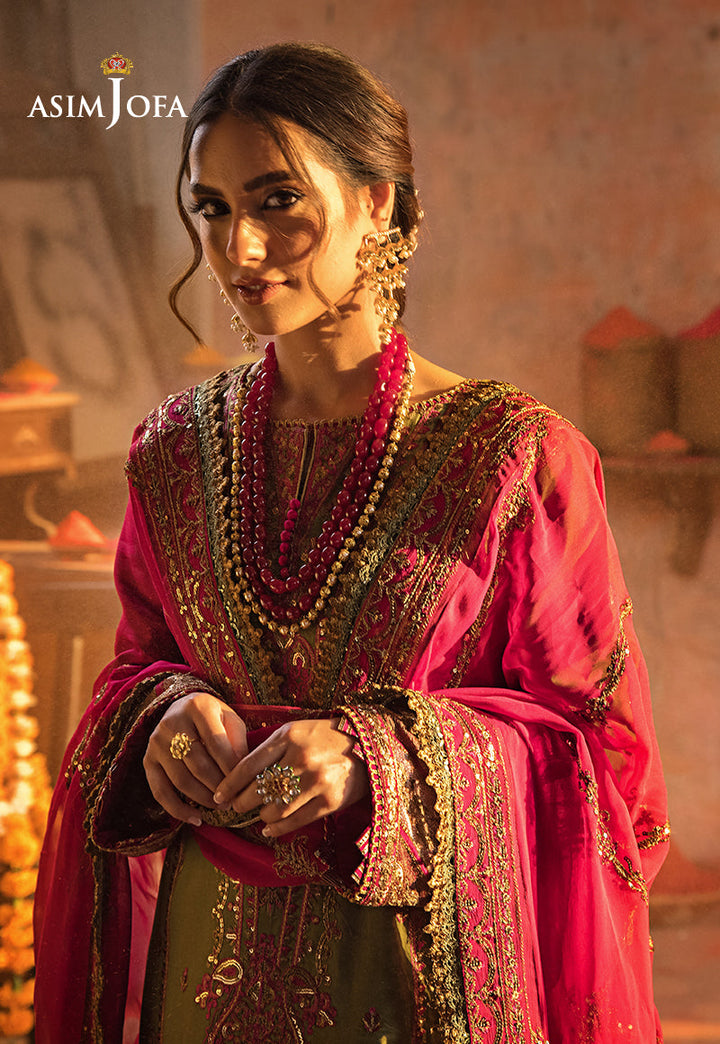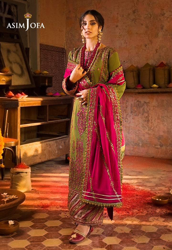 Iqra Aziz embodies the essence of Rung surrounded by beautiful colors with the golden sun bathing her in its glow.Taking a leaf from past this design combines the richness of colors with antique gold zari & sequins used with deep magenta thread creating this intricate design. The borders take inspiration from age old chatapatti stylized in embroidery rendered in two colored zaris with sequins sprawled on a contrast silk deep fuchsia base. It comes with a lushly embroidered chiffon dupatta & dyed trouser.