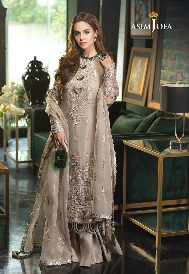 An epitome of beauty and elegance Komal Meer makes one skip a beat. Rocking this muted gold and golden green ensemble she truly is a sight to behold. The design is worked in rose gold tint zari with shading of green resham, punctuated by square mirrors giving this attire an eye catching luminance. It is paired with Champaign hued dust print motifs sprawled on silk making a beautiful Dhaka pajama. The overall look is timeless suited for any festive occasion.
