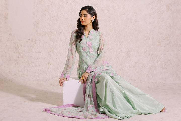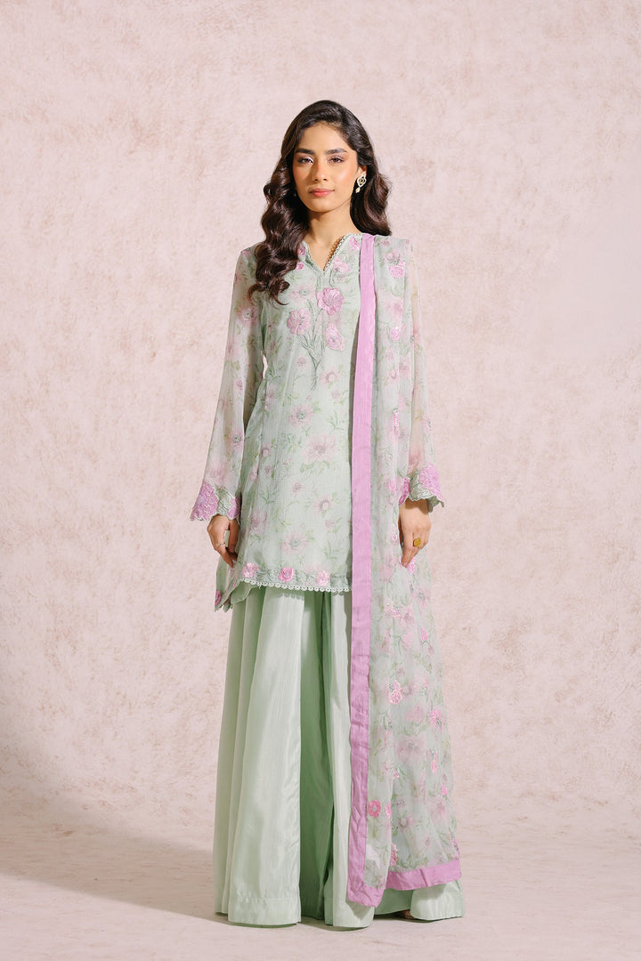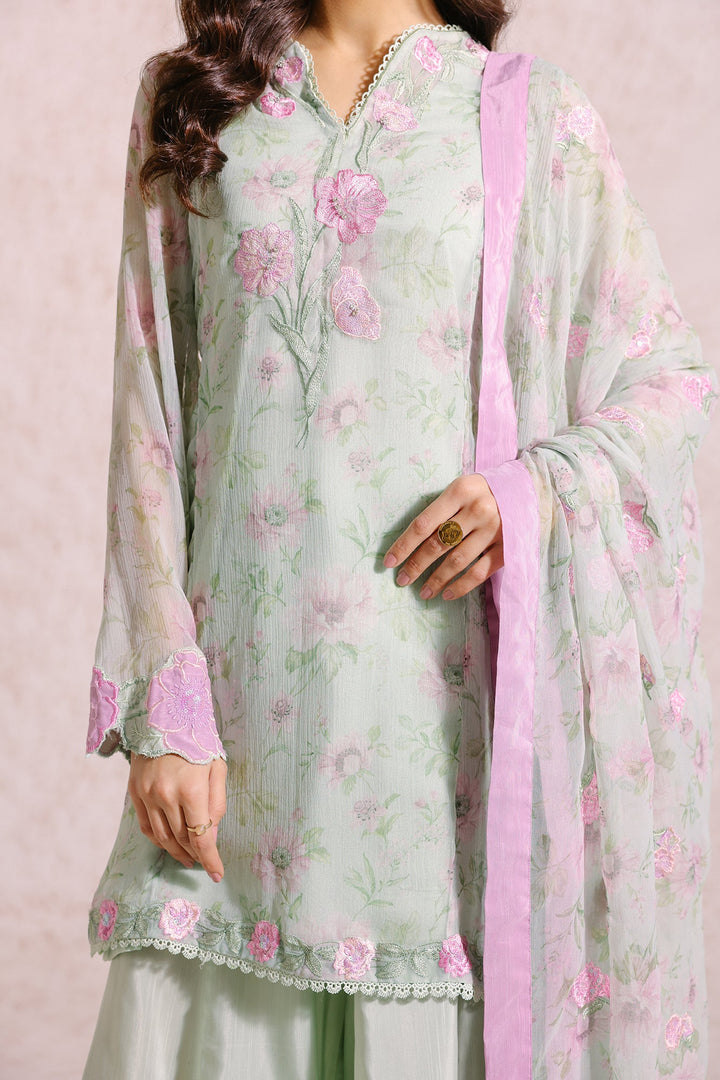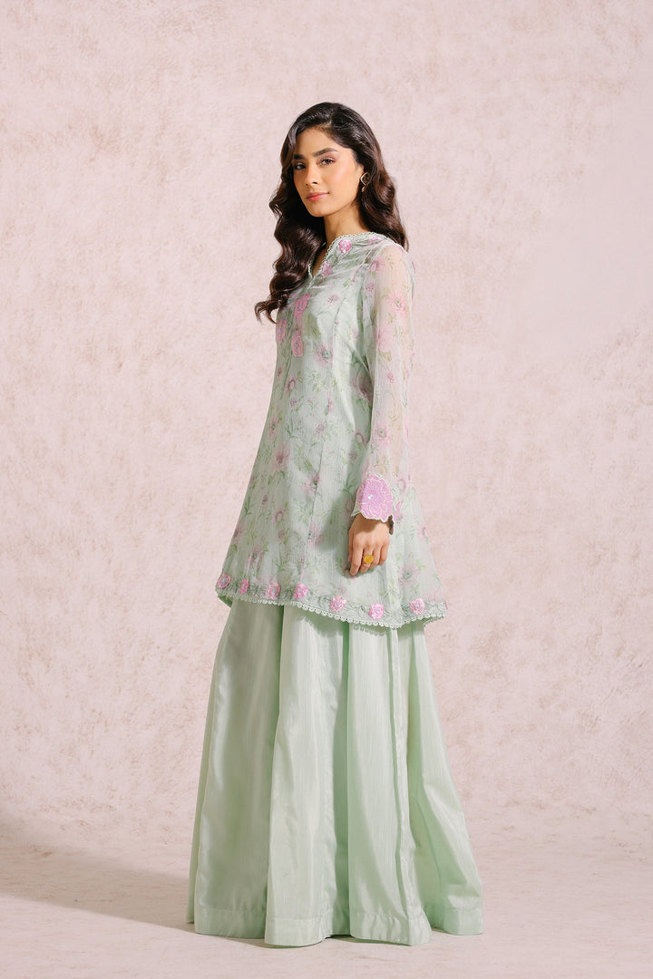 A classically rich composition is layered over this graceful ensemble rendered in a bright green shade. It features a contemporary A-line silhouette short length shirt adorned with beautiful floral prints and enriched with captivating embroidery with aesthetic details. Paired with a sleeveless inner slip and an elegantly flowing solid sharara, the enchanting look is complimented with a resplendent printed and embroidered dupatta. Embrace this alluring outfit at festive events this season.