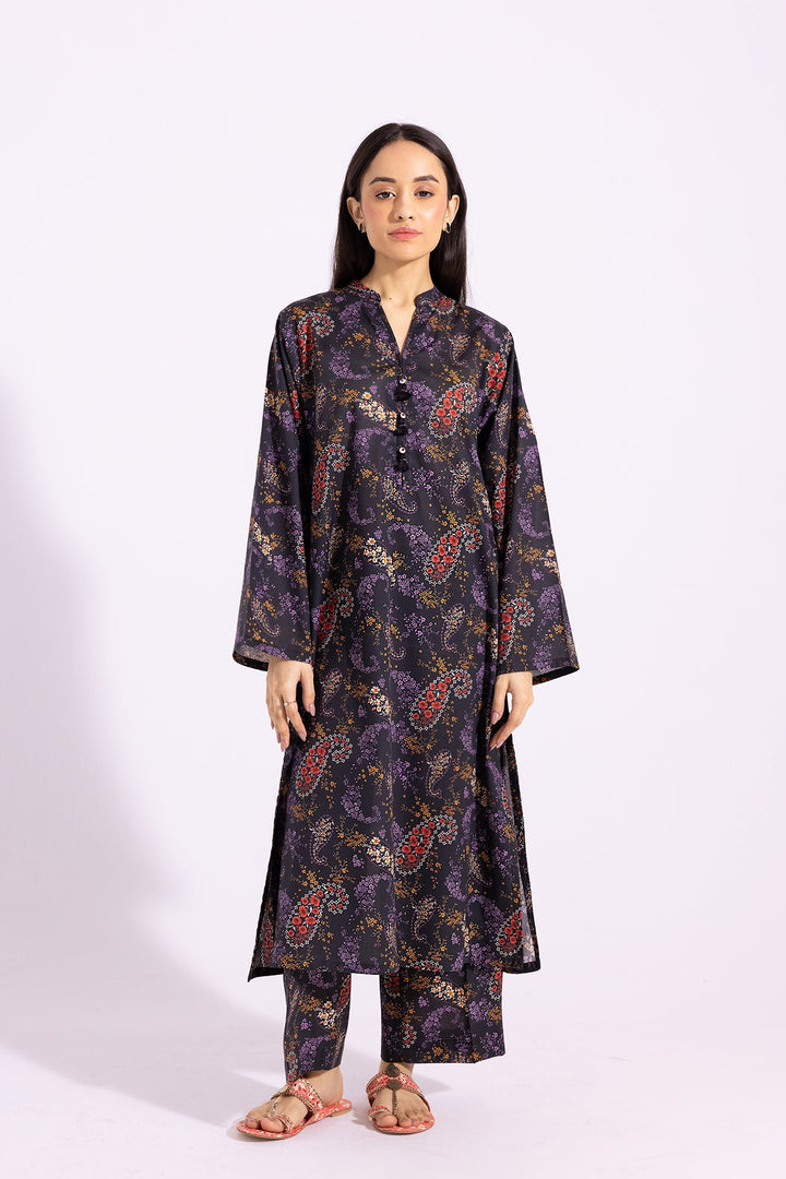 Elevate your look with this beautiful 2-piece ensemble. The floral pattern printed on a charming black canvas enriched with vibrant purple, mustard, orange and ivory tones that adds a classy touch to the elegant shirt, which is further enhanced by trendy tassels at the front. The matching trousers are contemporary and alluring, making this outfit perfect for this season.