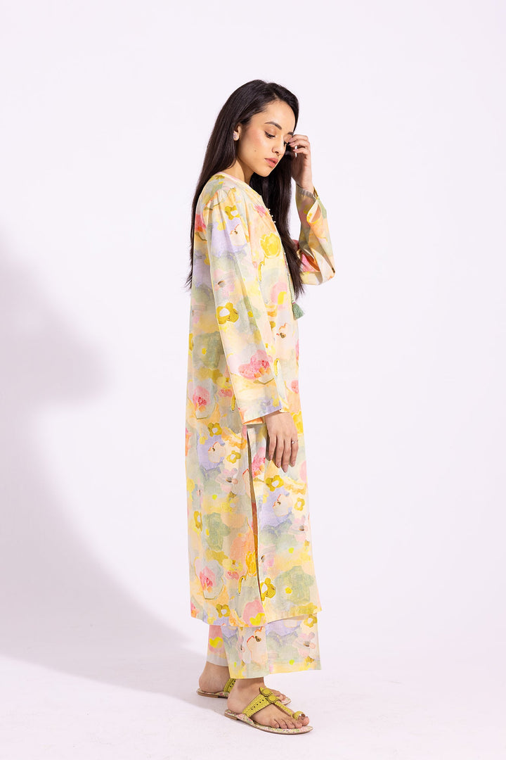 This mesmerizing ensemble features a 2-piece set with a classic aesthetic. The gleaming bright yellow shirt has gorgeous floral prints in mesmerizing hues and enhanced with trendy tassels and beads at the front. The matching trousers add a contemporary touch to this outfit, making it ideal for everyday wear during the this season.