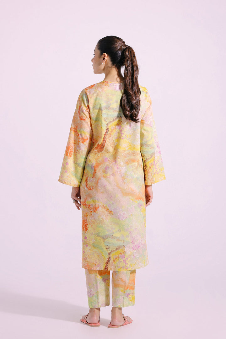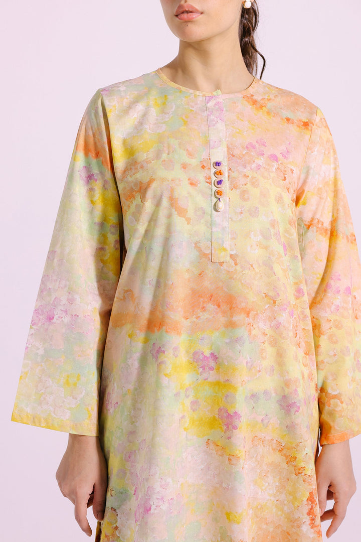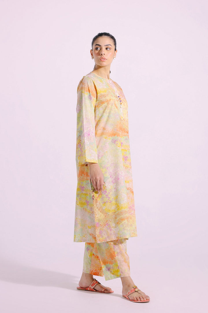 An enchanting composition is layered over this graceful ensemble portraying a gleaming yellow canvas. It depicts a contemporary silhouette shirt adorned with beautiful artistic prints in blooming colors and enhanced with trendy beads and buttons at front placket. Paired with a matching trouser, this aesthetically rich outfit is a great option for everyday events.