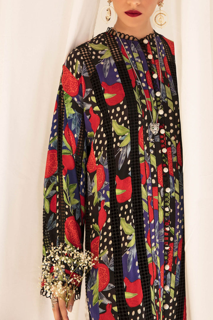 A canvas of obsidian ebony in 'Enora' is enlivened with a playful print of bright pomegranates juxtaposed with blooming folioles to depict vivid hues of , scarlet, and sage with tinges of azure and ivory making a bright, enticing composition. Adorned with intricate ebony lace insets, and paired with a tonal shalwar this bold yet tantalising shirt creates the ultimate summer look perfect for the fashion-forward woman.