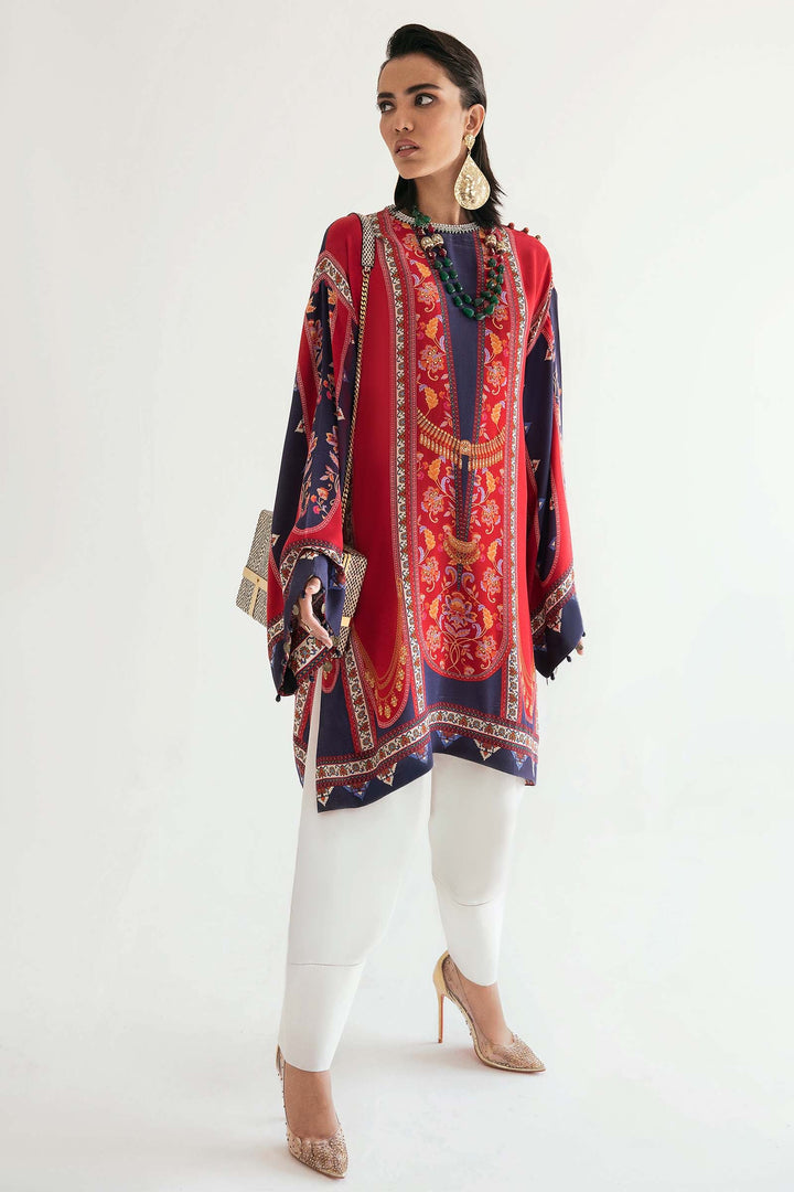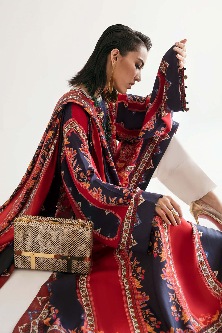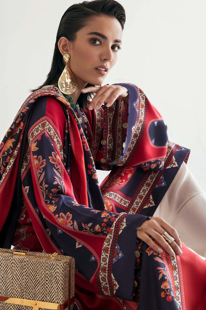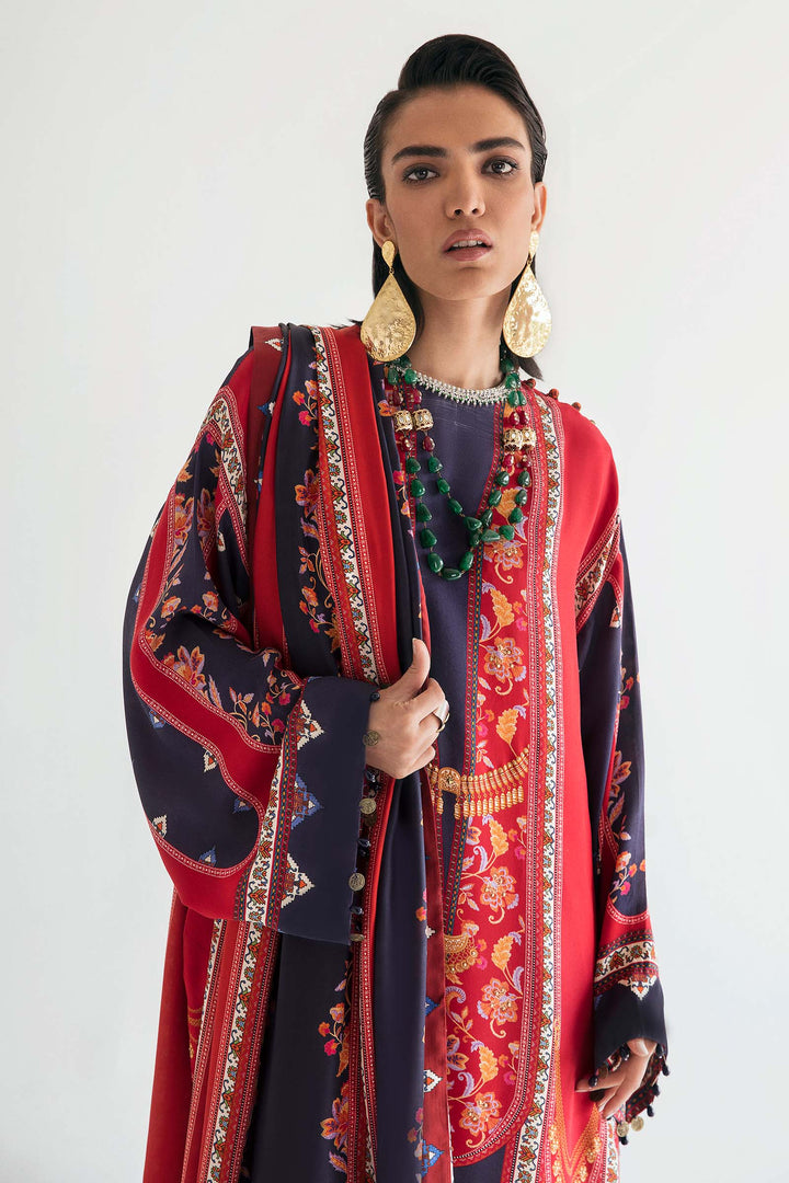 Rendered in bright hues of scarlet and deep eminence, ‘Galina’ is an elegant proposition for summer affairs. Patterned with delicate filigree and accentuated with a pearl and crystal embellished neckline, the crepe de chine shirt is tailored to a loose silhouette paired with a pure medium silk dupatta. This is a classically chic look, both wearable and versatile.
