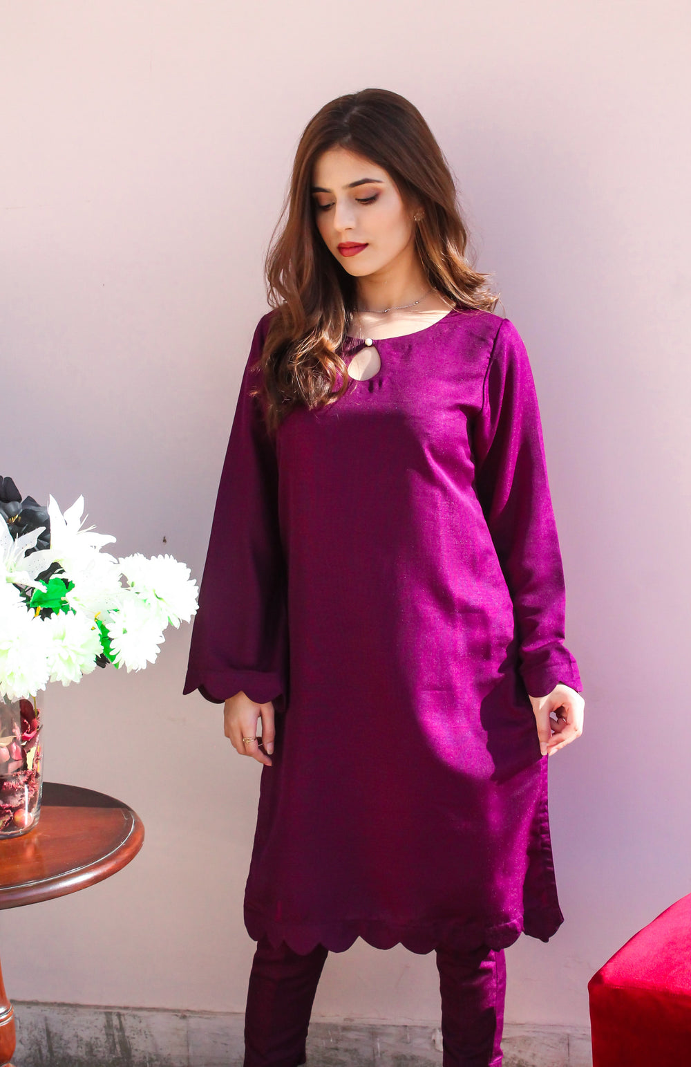 Two piece matching set with scallop detailing on sleeves, border and pants bottom.
